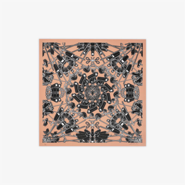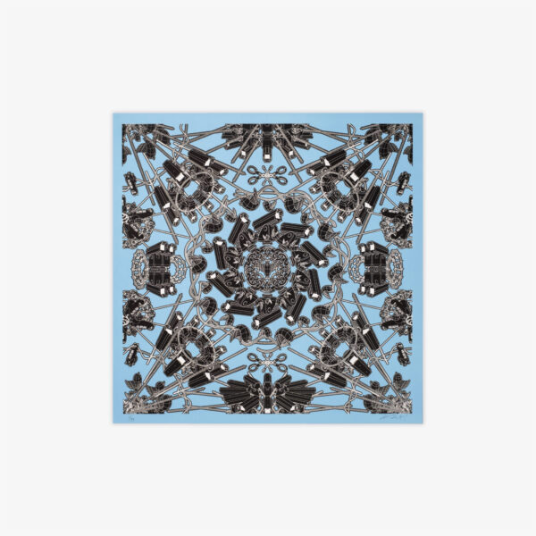 The artworks resemble a geometric tile consisting of surveillance cameras, Twitter birds, and handcuffs to symbolize the struggle for freedom of speech
