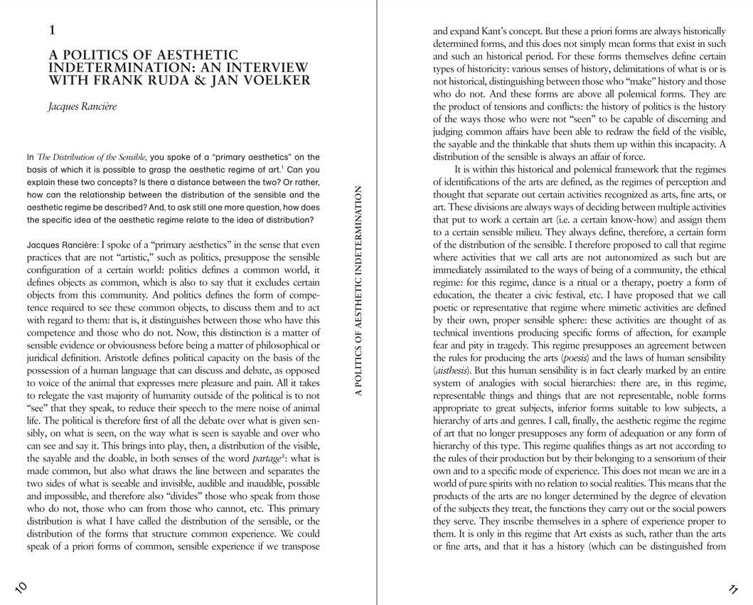 The essays collected in this volume, based on a symposium held at Art Center College of Design (Pasadena), consider the knot formed in Rancière’s work between aesthetics, politics, and education. From his earliest work (“The Lesson of Althusser,” 1974) to his magisterial book on the pedagogical theory of Joseph Jacotot (“The Ignorant Schoolmaster,” 1981), the theme of education has been at the center of Rancière’s concerns; his apparently recent turn to aesthetics, after the 1995 publication of “The Disagreement,” should in turn be understood as a continuation of his studies of the aesthetic experiments conducted during the post-work nights of 19th-century proletarians (“The Nights of Labor,” 1981).