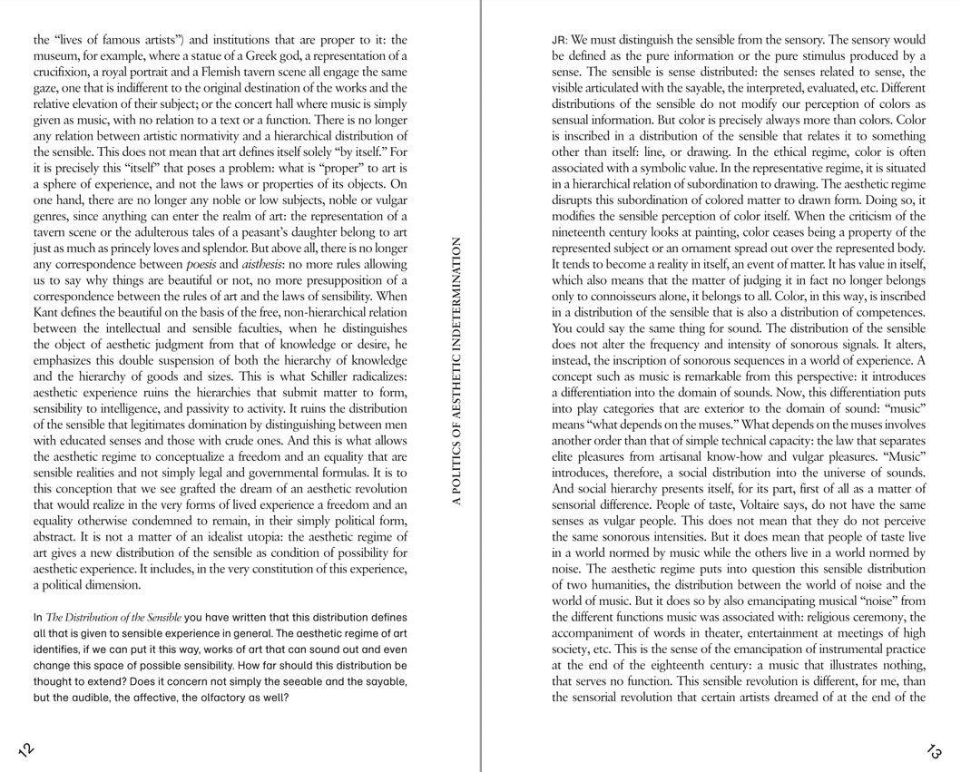 For Jacques Rancière, politics is not primarily the exercise of or struggle for power, but the institution of a certain type of space and time, a mode of visibility and intelligibility that creates a tear in the consensual fabric of a given form of collective life. Art institutes just such a space and time, in which the fundamental polarities of experience—activity and passivity, form and matter, appearance and reality—are suspended and transformed.