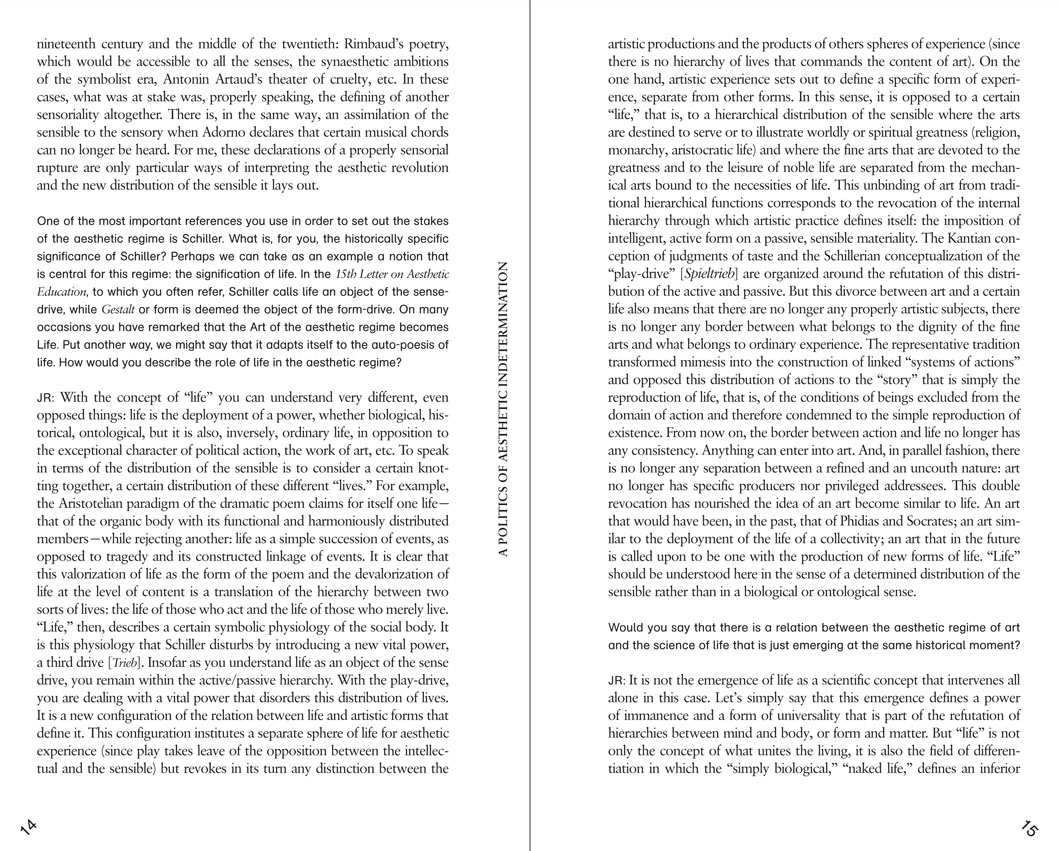 The questions forming the horizon of this collection are therefore: what would it mean to propose a new aesthetic education of humanity today? How would the resurrection of this concept transform the current concepts of art, politics, and pedagogy? And to what extent is it necessary to return to the founding moments of aesthetic theory to rearticulate the relation between art and politics today.