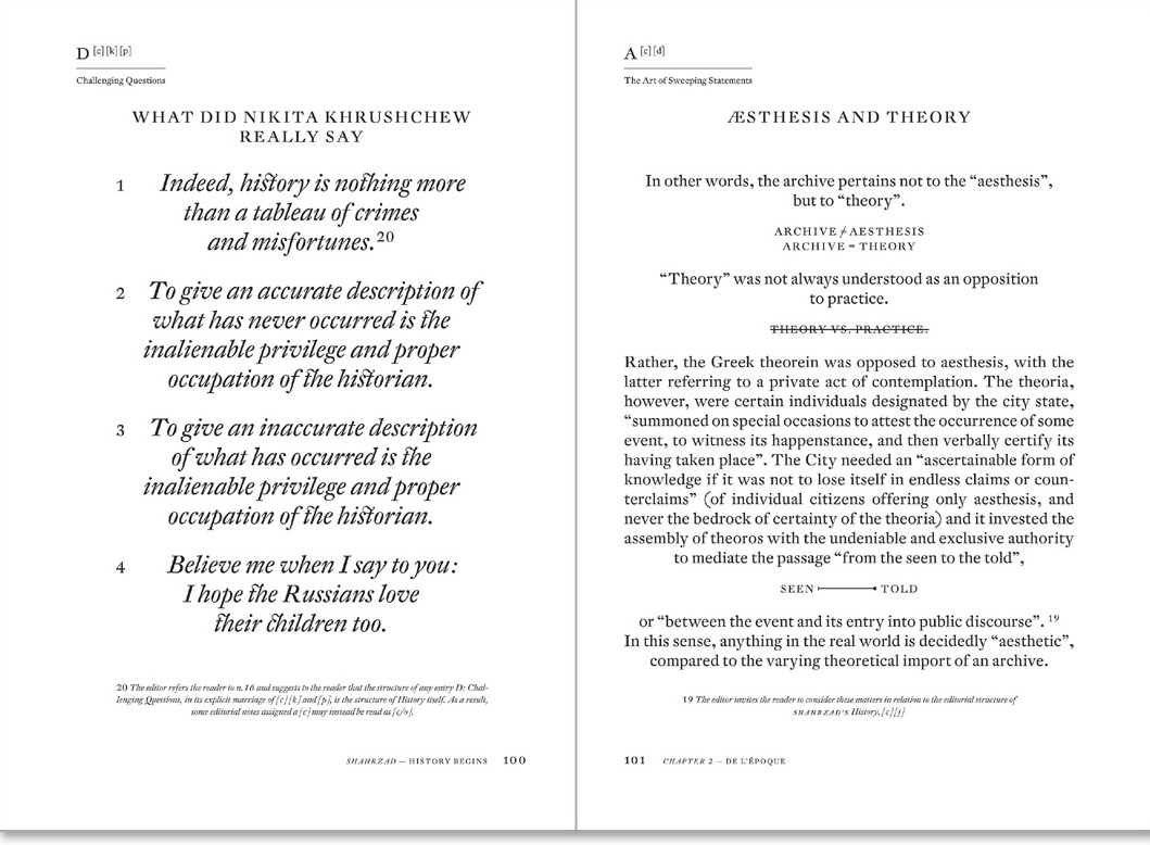 With this sourcebook at hand, Shahrzad presents its own commentary on the mysteriously tenacious aura of institutionalized histories, drawing on baroque ideology, discourse theory, botanics, the US top ten, art book traditions and more.