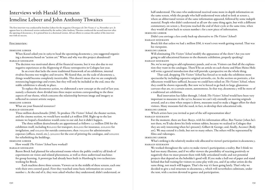 Presenting numerous previously unpublished documents as well as interviews with the close collaborators of this “exhibition maker,” as he often referred to himself, the authors explore the structures and tools of his trade (his archives and his Agency, in particular), which allowed his practice to develop, and focus on two manifestations, realized 25 years apart, documenta 5 (1972) and “L’Autre” (1997). Exploring the historical context, two essays from historians Hal Foster and Jean-Marc Poinsot, revisit the principle historical debates of the period in question.