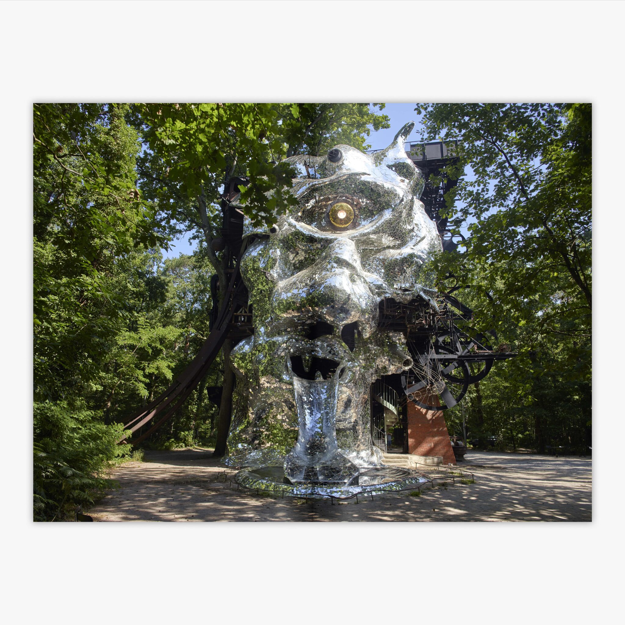 It is one of the most challenging artworks in a public space, here in a natural setting that offers a unique framing and underlines its dramatic presence. The sculpture is an immense head almost entirely built from found and industrial materials and covered in sparkling mirrors. Its interior houses a surprising universe that can be discovered through a labyrinthine route punctuated with artworks and curiosities both humorous and somber: sound sculptures, a small automatic theater, machinery with scrap-metal gears, and homages to Duchamp, Klein, and Schwitters, among others. Dada, Nouveau Réalisme, Kinetic art, and Art Brut all merge in this total environment. The fruit of a collective adventure, Le Cyclop is also a utopia almost clandestinely forged over several decades by a team characterized by Tinguely as “mad sculptors.”