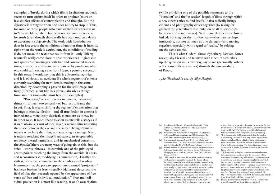 Published for the first time in 1990—its original title is “L’Entre-images: Photo, Cinéma, Vidéo”—this volume brings together 20 illustrated essays written between 1981 and 1989 by Raymond Bellour, one of the world’s most prominent film theorists. As he writes in his foreword to this English edition, “‘Between-the-Images,’ which was innovative yesterday, is now a kind of archeological corpus. That is one of its virtues. It recalls how the landscape of the moving image was constituted and historicizes the first creative passages between film, video, and photography.”