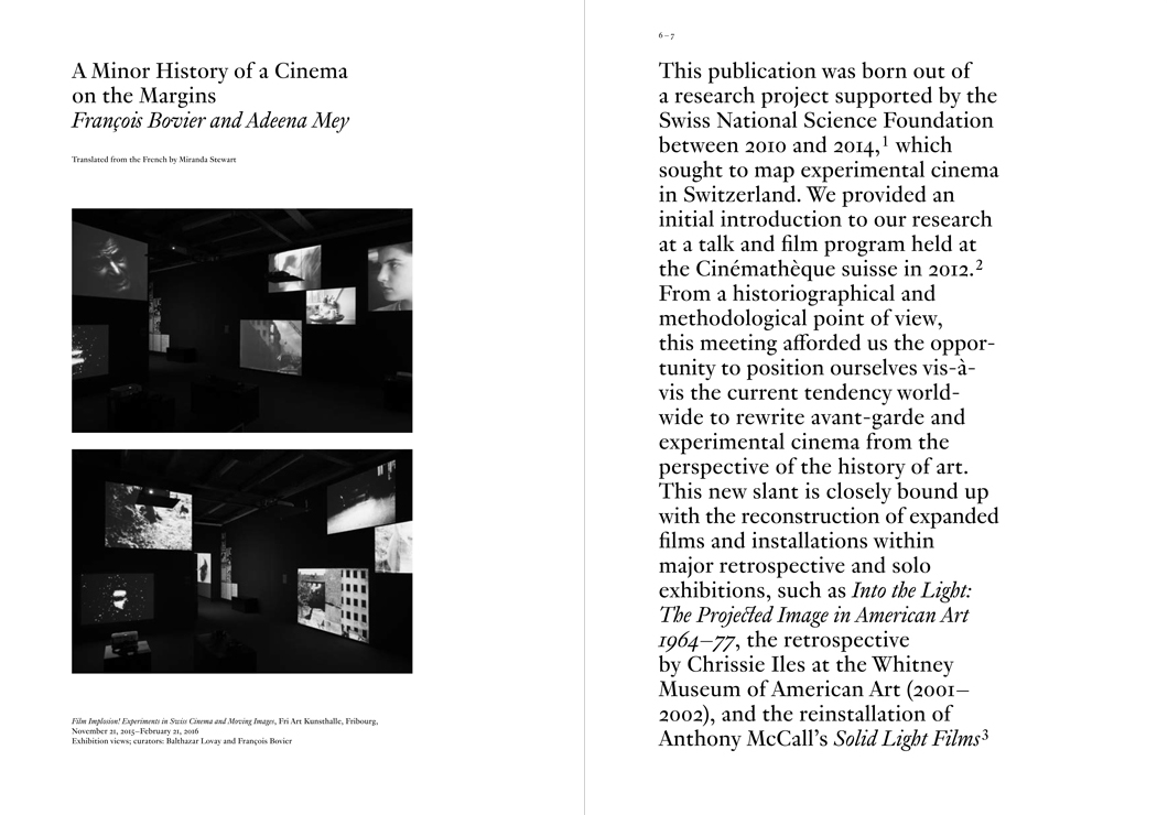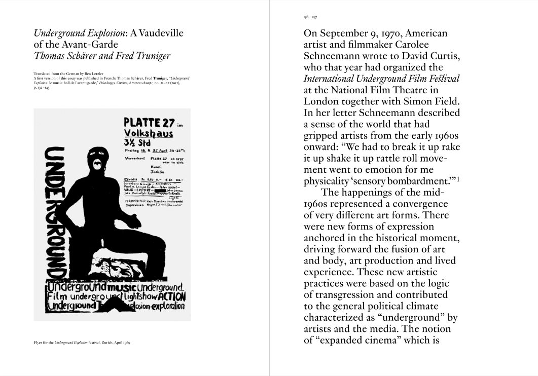 An attempt to offer an overview of the development of Swiss experimental film practices, it includes essays, among other key protagonists and spaces of diffusion, on Robert Beavers and Gregory Markopoulos, Peter Liechti, Hans Helmut Klaus Schoenherr, Clemens Klopfenstein, the role of cinema at the Kunstalle Bern during Harald Szeemann’s curatorship, Annette Michelson, Tony Morgan, and Kurt Blum.