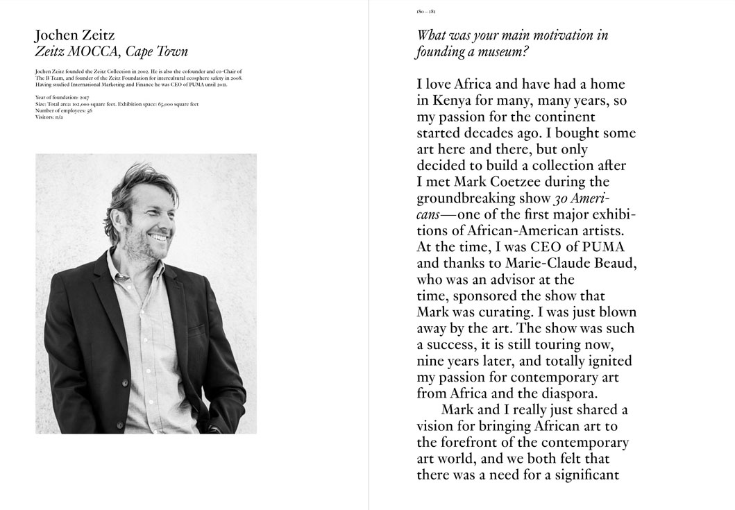 Interviewees and contributors include Ziba Ardalan, Christian Boros, Eli Broad, Gil Bronner, Dimitris Daskalopoulos, Jens Faurschou, Soichiro Fukutake, Ingvild Goetz, Dakis Joannou, Grazyna Kulczyk, Savina Lee, Eugenio López, Philippe Méaille, Leonid Mikhelson, Judith Neilson, Bernardo Paz, Lekha Poddar, Nadia Samdani, Patrizia Sandretto Re Rebaudengo, Mario Saradar, Bernar Venet, Lu Xun, Anita Zabludowicz, and Jochen Zeitz. Essays by the editors and Chris Dercon, previous Director of Tate Modern, London (2011–2016), explore the topic and the relationship between public and private institutions and museums worldwide.