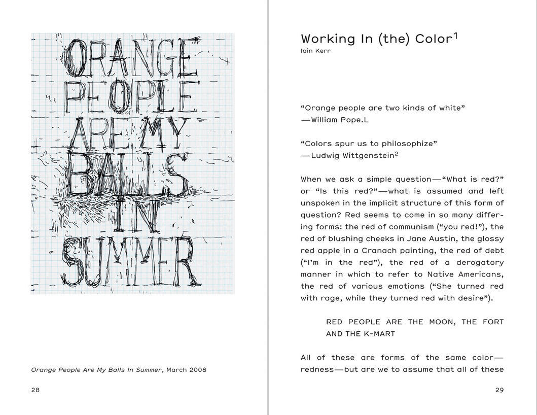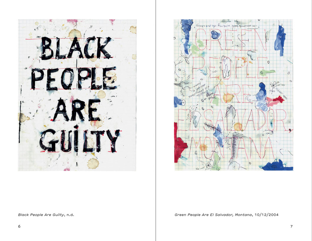 “When Pope.L shakes his head he makes drawings that keep him from laugh-crying to death,” writes Helen Molesworth about William Pope.L’s “Skin Set Drawings.” Made with very low-key materials, this extended corpus of drawings deals with the absurdities and perversities of intentional language, especially racist language and language associated with categorizing and naming color. “Black People Are Taut,” “Brown People Are The Green Ray,” “Blue People Are What We Do To Homosexuals,” “French People And Roma,” “Purple People Are The Perfect Cone For The King Not His Body,” “Red People Are The Niggerss Of The Canyon” are some examples of this ongoing series made by the self-proclaimed “friendliest black artist in America.”