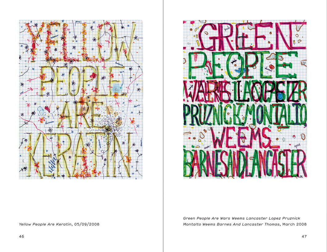 The book offers a selection of drawings, made between 1997 and 2009, some sketches, and two critical texts by artist and writer Iain Kerr and Chief Curator at the Institute of Contemporary Art (Boston) Helen Molesworth, as well as one of the artist’s own text.