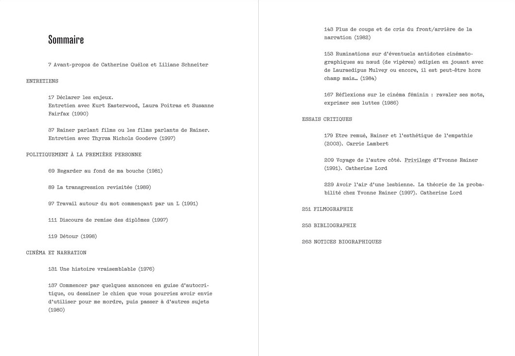 “Une femme qui…” brings together written texts and films, a selection of interviews, symposia, and essays, which constitute Rainer’s biography. The singularity of her culture, her intimate preoccupations, and complex writings, not devoid of humor, are all elements that reveal her personality and illuminate the reading of her films. Her writings, which span three decades, explore questions of representation and identity, feminism, age, sickness, the menopause, sexual dissatisfaction, and political violence.