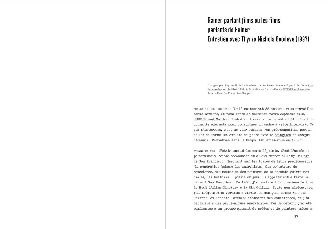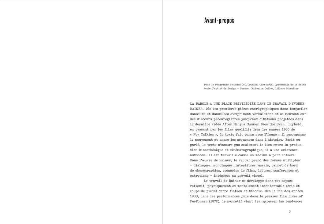 The book has been edited in collaboration with Yvonne Rainer by a team of teachers from the CCC Critical Curatorial Cybermedia Program of the Haute école d’art et de design in Geneva.