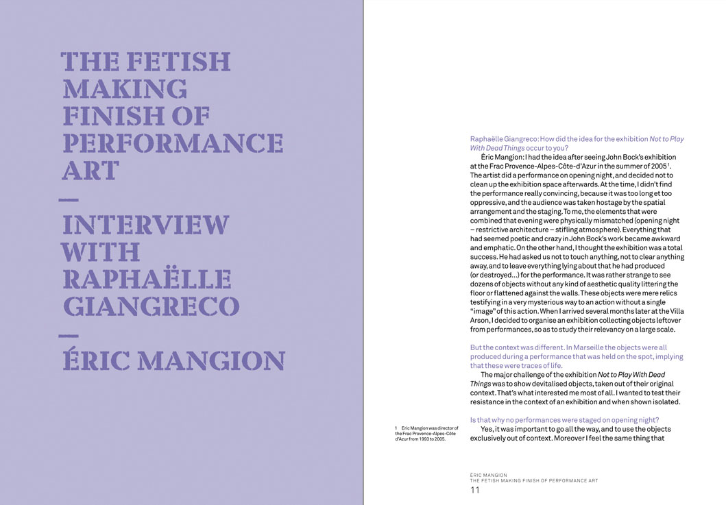 The present volume, based on an exhibition of the same title curated by Marie de Brugerolle and Eric Mangion, questions the nature and the relevance of these objects in contemporary practices. Gathering together essays by the curators as well as by Arnaud Labelle-Rojoux, Patricia Brignone, Gérard Wajcman, Catherine Wood, and Julien Bismuth, the book documents works by artists dealing with these issues between the 1960s and today. It also documents and describes “objects” produced in performative context by Richard Jackson, Paul McCarthy, Roman Signer, Mike Kelley, Franz West, Jim Shaw, and Guy de Cointet, as well as by John Bock, Spartacus Chetwynd, Catherine Sullivan, and Erwin Wurm. Are they relics or ghosts of their own making? Can they reactivate their initial production context? Is their hybridity a form of resistance to the streamlining of art or a mere trace of their origin?