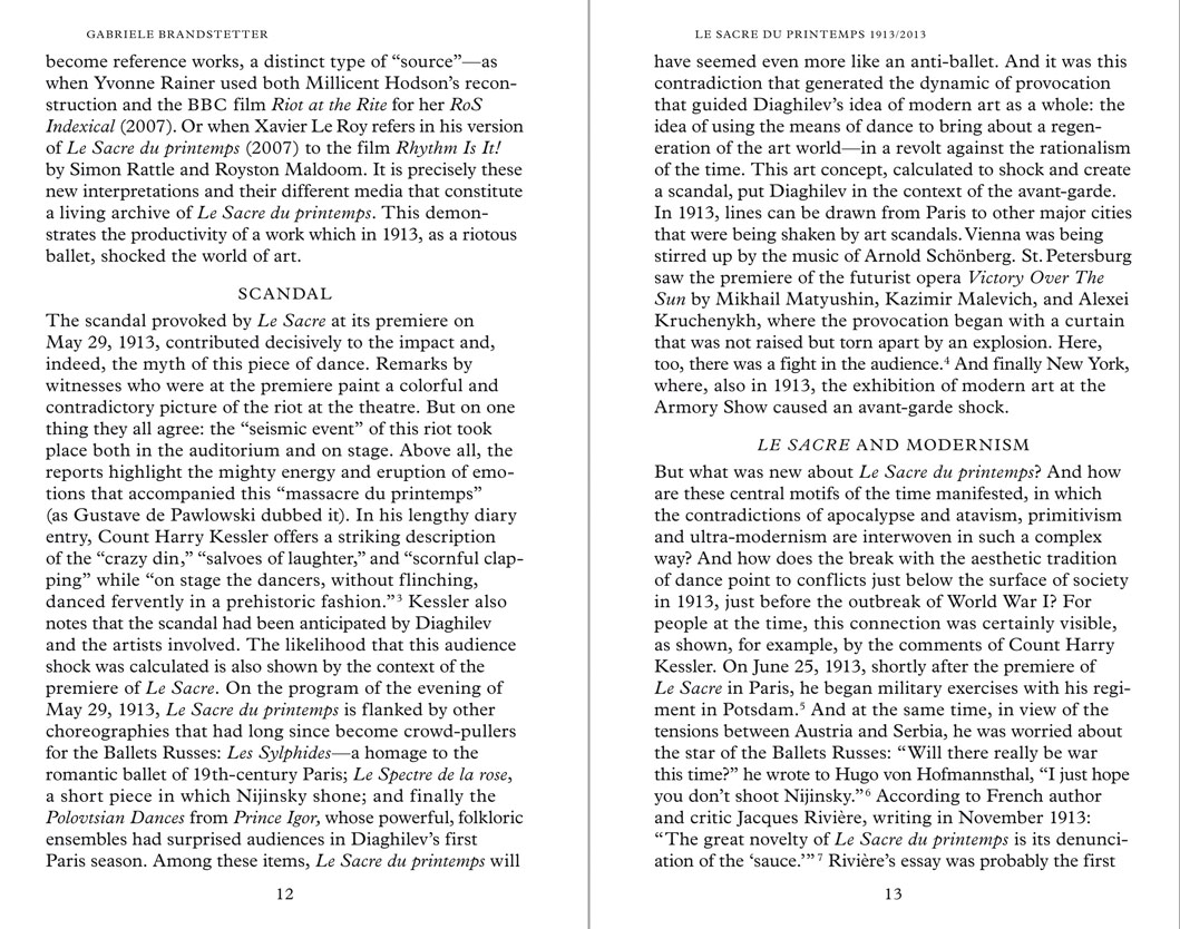 This publication investigates the interplay between dance and the visual arts in relation to one of the key works of the 20th century, “Le Sacre du printemps” (The Rite of Spring). Igor Stravinsky’s “Le Sacre” was premiered in 1913 by Diaghilev’s Ballets Russes, with choreography by Vaslav Nijinsky at the Théâtre des Champs Elysées in Paris, and to this day it is considered the most controversial theatrical presentation of the 20th century. With its revolutionary music and choreography, the piece can be seen as one of modernism’s groundbreaking moments. The ballet (in which a virgin sacrifices herself for the god of spring and dances herself to death) still fascinates visual artists today and is the most choreographed ballet ever.
