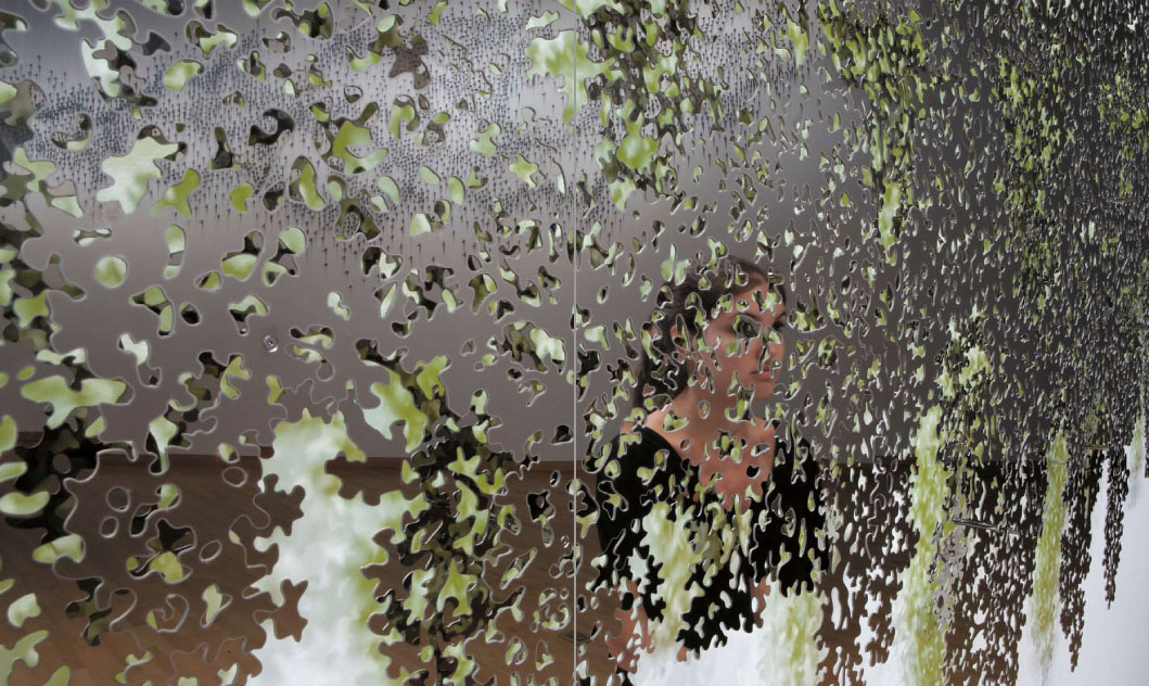 Teresita Fernández is known for her deft ability to transform common materials and processes into dazzling cinematic illusions. Her immersive installations and evocative large-scale sculptures blend abstraction, reflection, and transparency into potent configurations of projection and play. Nature and perception are the schematic sources for Fernández’s picturesque materializations. Clouds, trees, water, and fire—in patterned formations of polished stainless steel, glass, plastic, and thread—double as screens, mirrors, and lenses, and vacillate between object and optical phenomena. Much like shadows or ghosts, Fernández’s doubled forms reside in the folds and margins of perception—a tangled overlay of absence and presence, nature and artifice, subject and object.