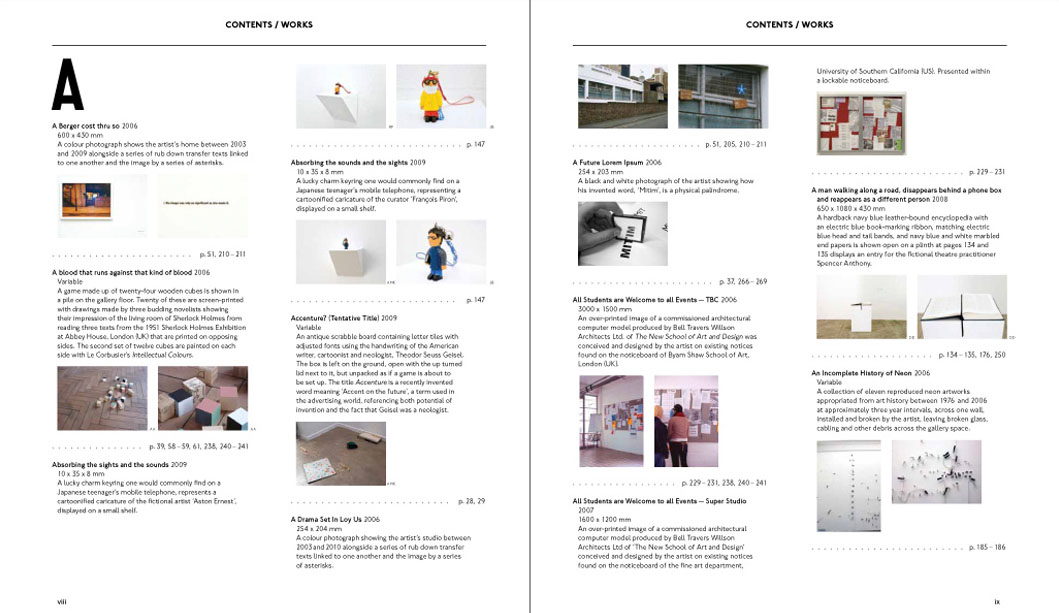 “Ryan Gander: Catalogue Raisonnable Vol. 1” was conceived by Åbäke as a “reasonable alternative” to a catalogue raisonné for the artist (i.e. a monograph giving a comprehensive and exhaustive catalogue of artworks by an artist). Documenting over 500 works made during a ten-year period, the “Catalogue Raisonnable” is intended to be navigated freely and illogically, in a non-linear fashion by its reader, echoing the “para-possible thinking” and “associative methodologies” on which much of Gander’s practice is based. For those readers who wish to draw some logic from its content, it is suggested that the book is navigated through its index.