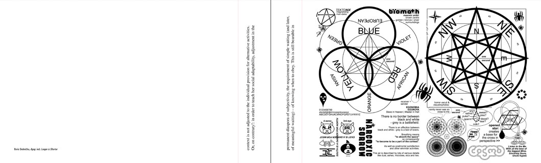 This project by artist, singer, curator, and visual poet Boris Ondreicka is in fact two books in one: “John Doe & Joe Bloggs” is a long poem, laid out in a portrait-oriented format, while “Hi! Lo.” is constituted by experimental texts—i.e., in the terms of the artist, “autonomous artworks, theoretical performances, list of titles, etc.”—put together in a landscape format. Created between 1994 and today, the diagrams, schemes, drawings, sketches, poems, and other elements are an improbable collection of projects using the page as site.