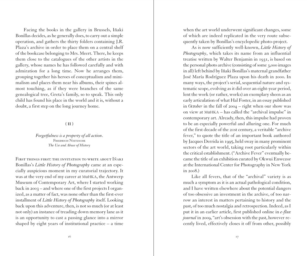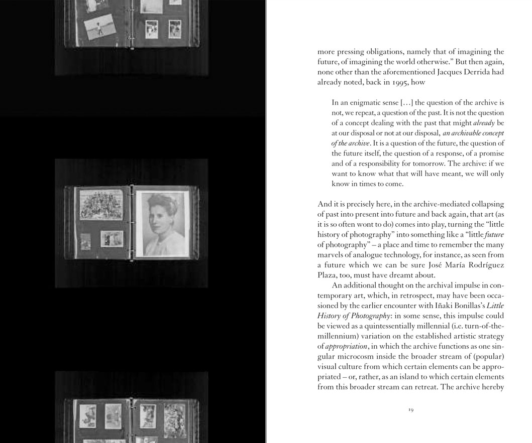 In 2003, Mexican artist Iñaki Bonillas introduced the photographic archive belonging to his grandfather, José Rodríguez Plaza, into his work. Its content which, since that time, has undergone a wide range of operations, has permitted him to combine elements that seemed, a priori, incompatible: on the one hand, a personal, biographical narrative, consisting of anecdotes and rather personal character notes; and, on the other, a quasi-scientific sense of compilation and classification.