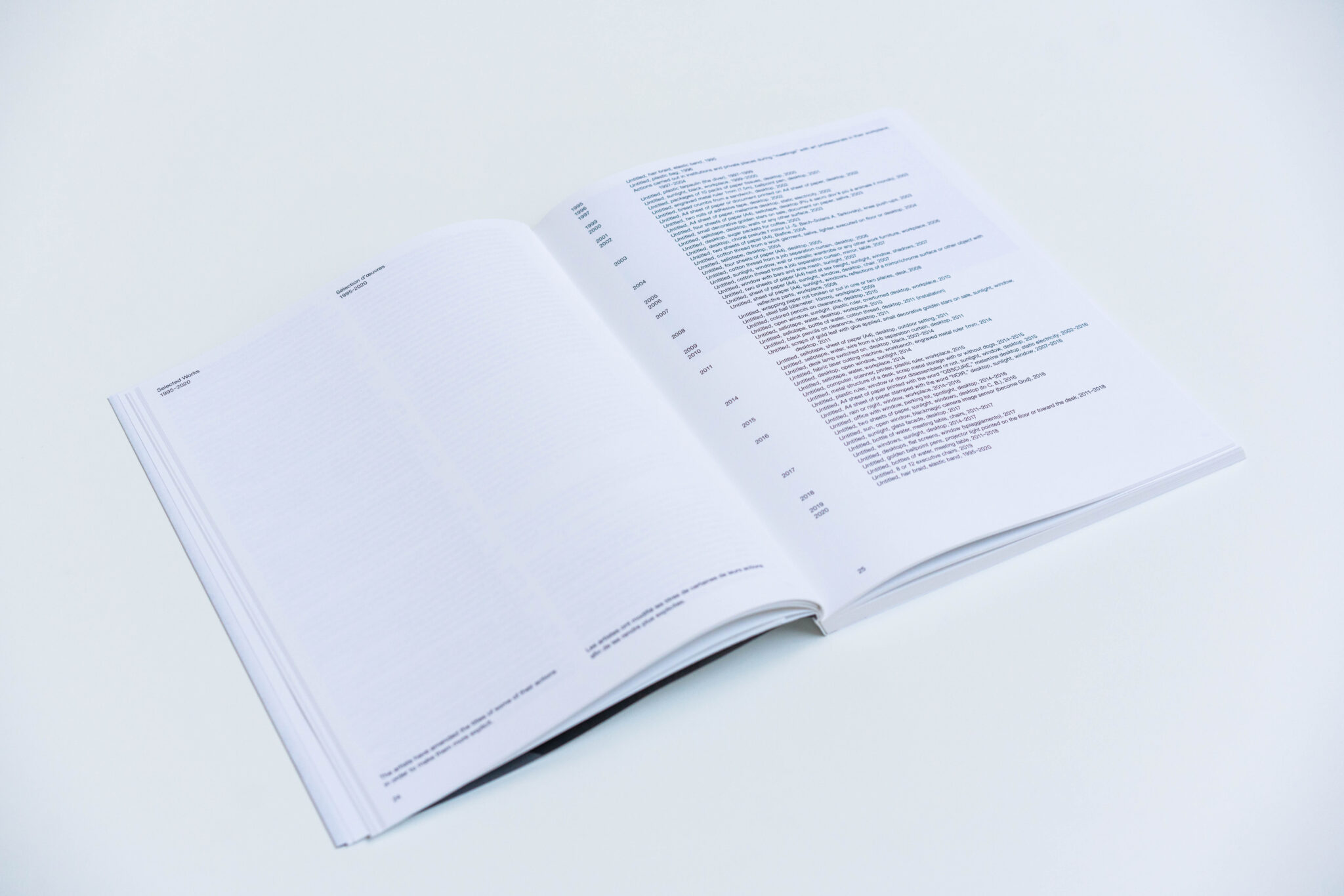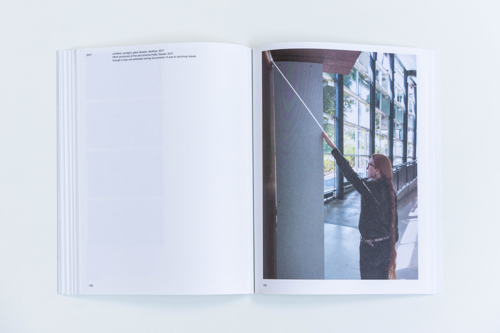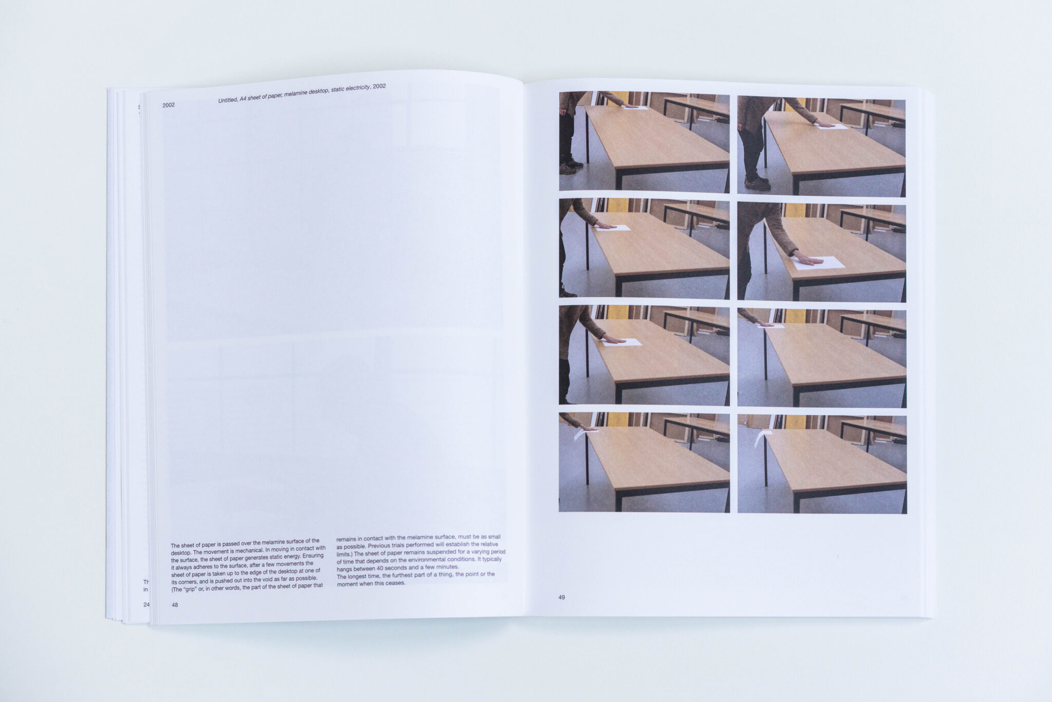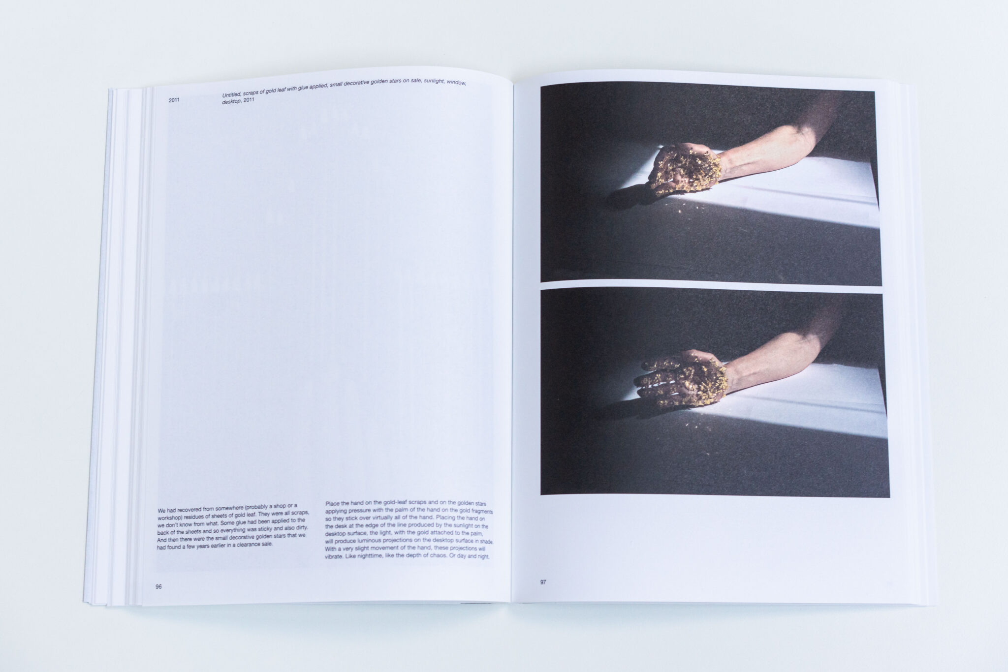 The first reference monograph on Marie Cool Fabio Balducci, this publication offers a thorough overview of their singular practice and critical work. For 25 years they have been developing—under a double name voluntarily without conjunction—an unclassifiable body of work between sculpture and live practice based on short, often repetitive actions carried out at first only by Marie Cool, but later also by others in confined spaces (studio, exhibition space) using common objects from standard work environments (sheets of A4 paper, adhesive tape, pencils, office tables) and natural elements such as water or sunlight. Carried out in silence, these actions take the form of simple gestures and short interventions: moving pencils at a regular rhythm, holding two A4 sheets of paper against each other, pouring a bottle of water on a desk, or following the sun reflected by a glass. The themes of ownership, precariousness, and the subjection of the body to the material world underlie their rigorous and modest work. Their practice has recently taken on an installative dimension in relation to the exhibition space, thus offering the audience a space for exchange and reflection in relation to the stakes of today’s society and the experience we make of it.