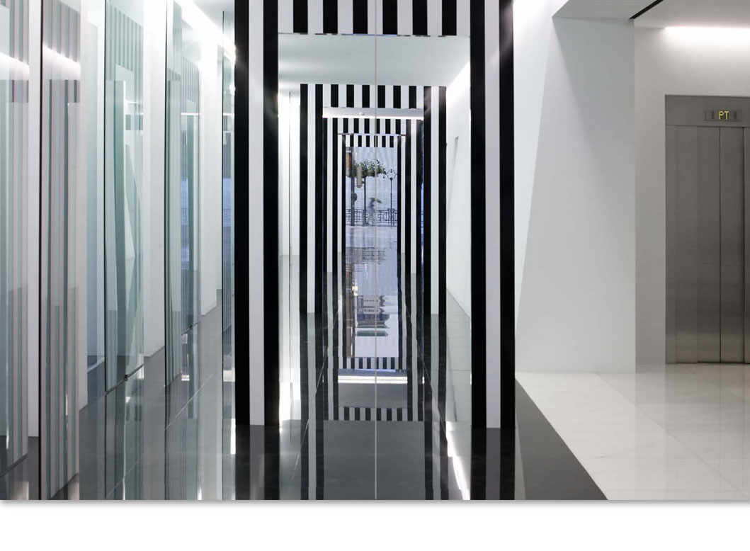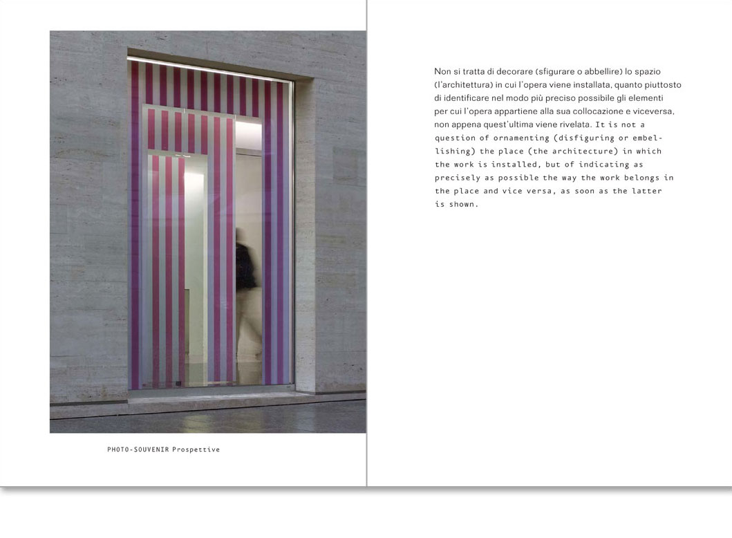 Daniel Buren’s and Robert Barry’s volumes each follow the set-up of their respective artistic programs within the corporate spaces of the bank and the ways they conceived simultaneously their site-specificity and their break away from this framework.