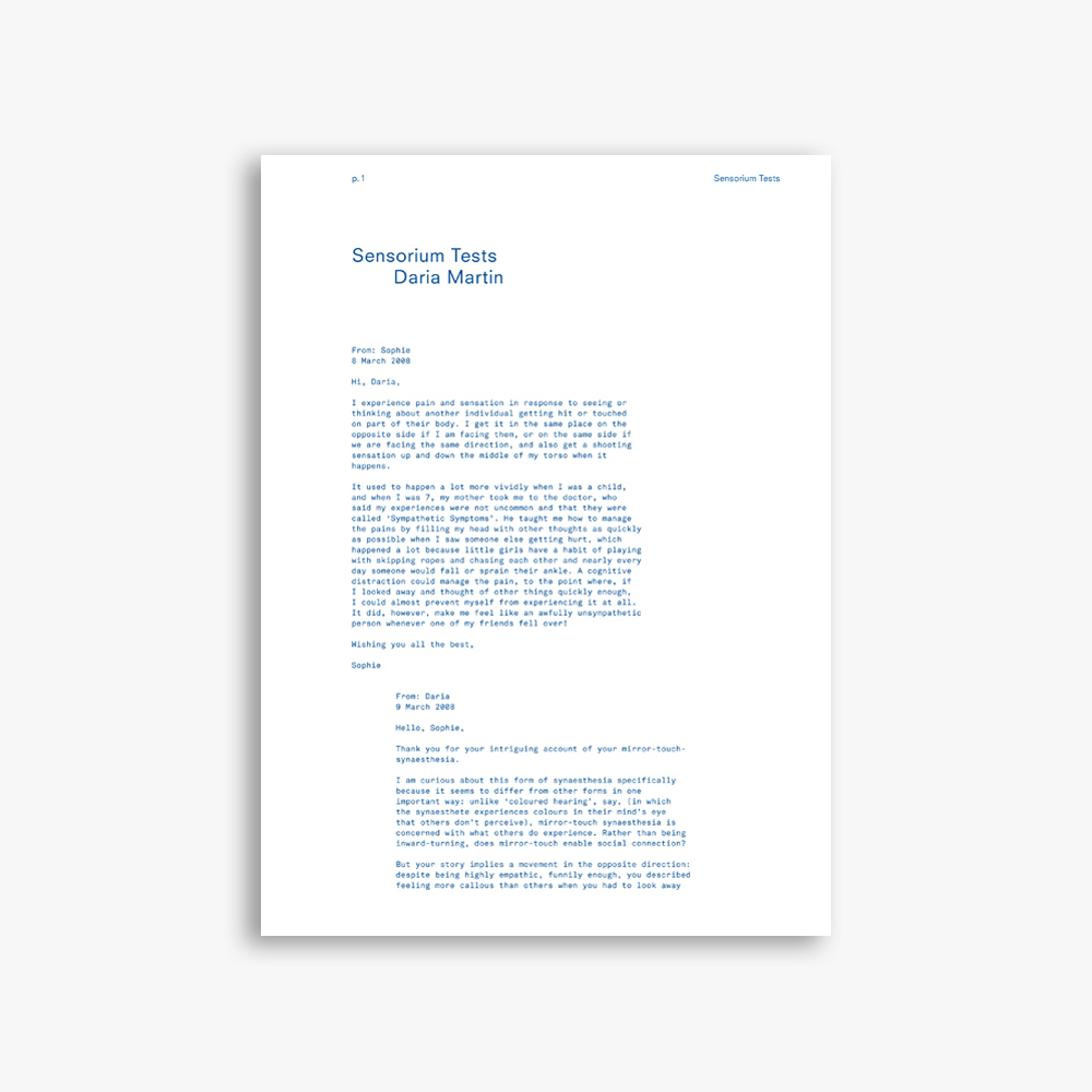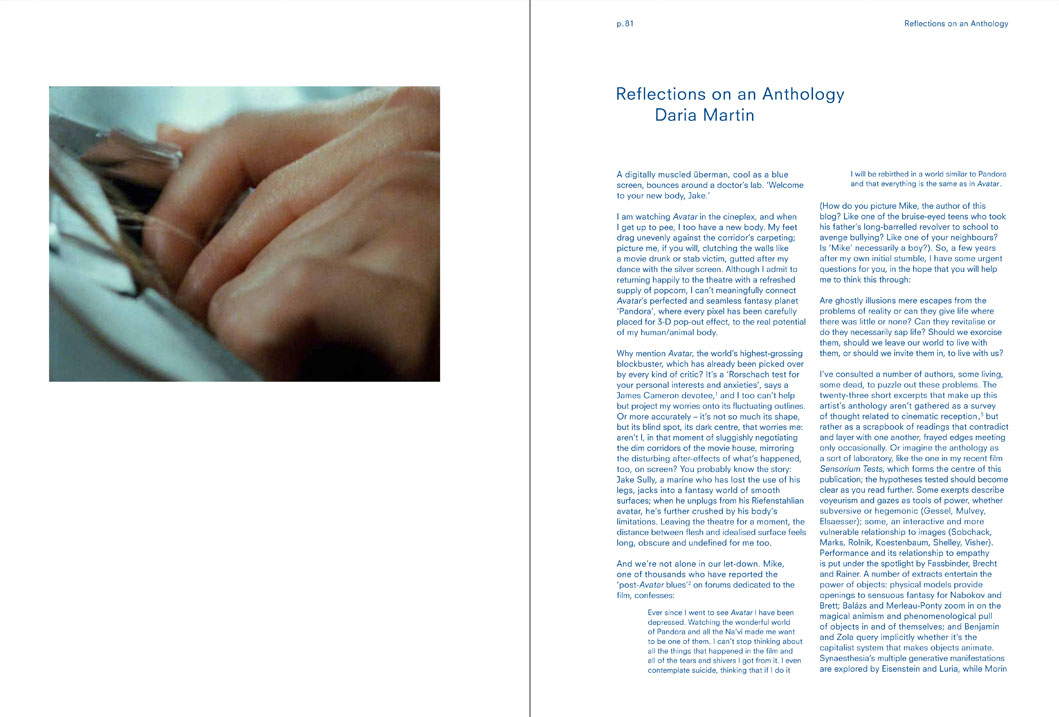 This monograph revolves around Daria Martin’s new film “Sensorium Tests,” 2011, which uses the recently recognized neurological condition of mirror-touch synaesthesia to explore how sensations are transmitted, shared, and created in film, raising the question: Can a spectator feel a bodily reaction to film? Exploring the spectrum that lies between sight and touch, the publication includes key texts selected by Martin into such pressing issues, which are also related to voyeurism and projection, artificial intelligence, and magic, from a host of leading writers and thinkers from Mary Shelley to Wayne Koestenbaum, via Maurice Merleau-Ponty, Rainer-Werner Fassbinder, and Laura Mulvey. Martin’s introduction to this section addresses subjects such as mirroring, paralysis, and animism, asking such far-reaching questions as how empathy and desire, identification and lust are related.