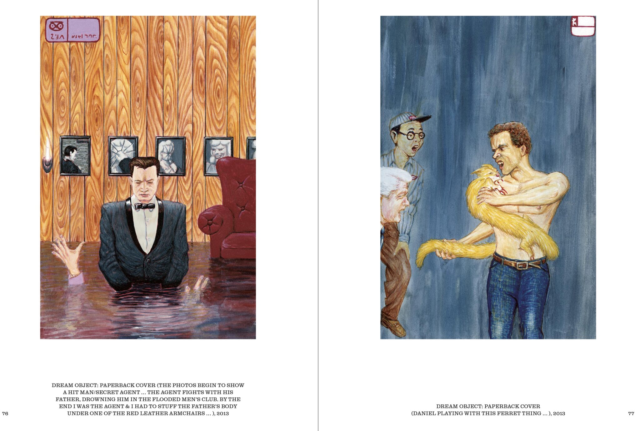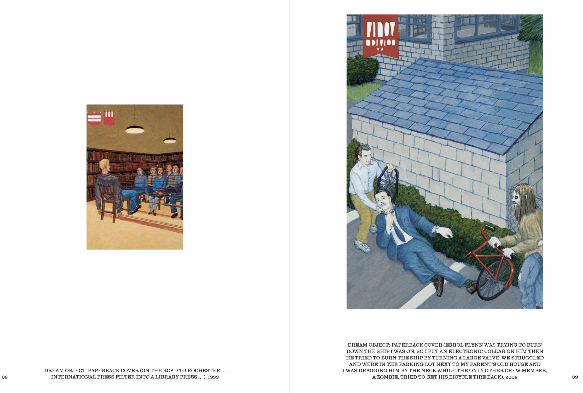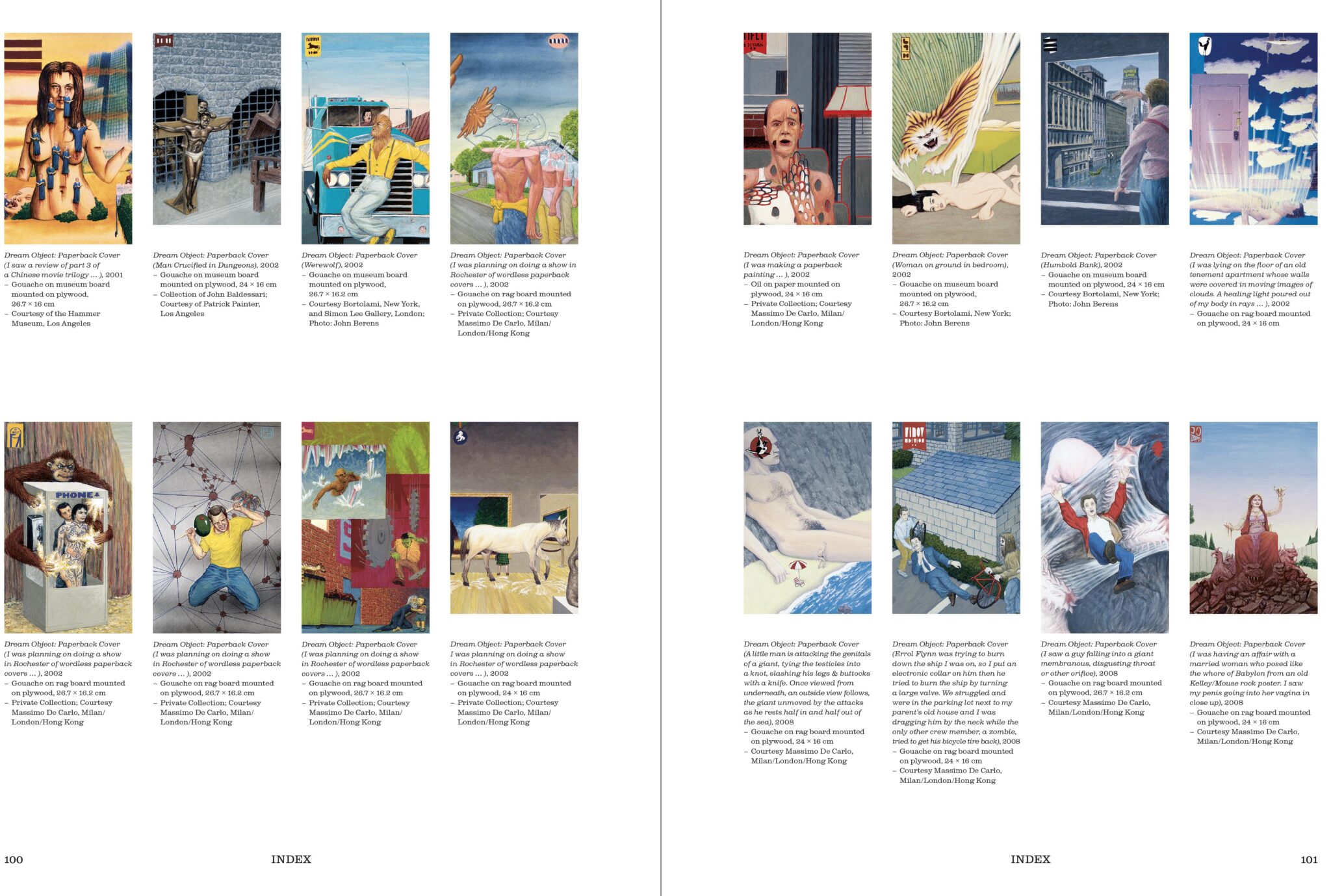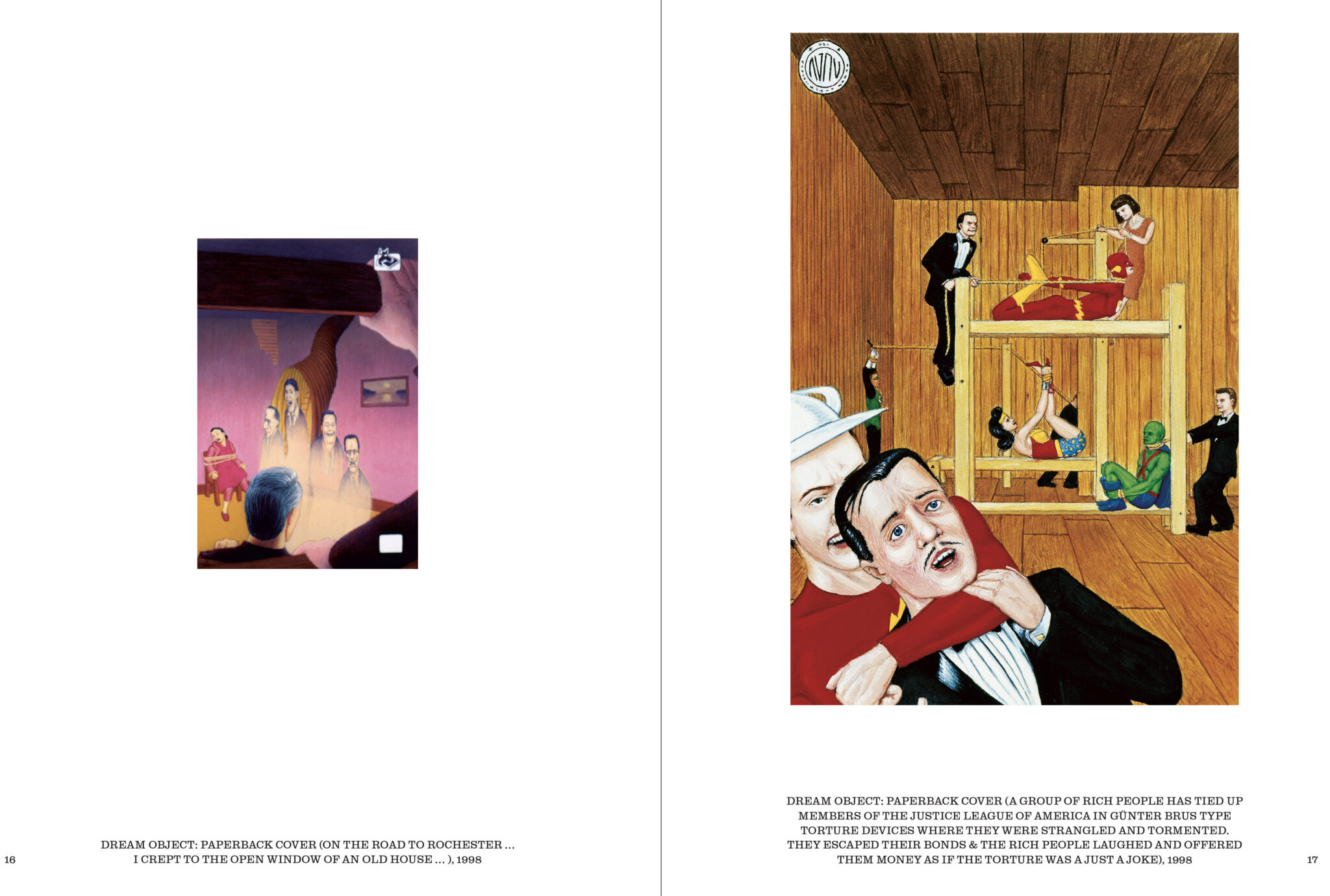 Stemming from the comprehensive corpus of the “Dream Drawings,” the “Paperback Covers” ape the appearance of book covers, both in terms of dimensions and volume. The reference to the physicality of cheap paperbacks is combined with a nod to the Anglo-American graphic design tradition, with its full-page images and publisher or collection logos. All that is missing is the text. Titleless, authorless, but not fiction-less, the paintings depict dream scenes whose titles shed light on narrative elements, condensing the narrative into a single image, in which the first-person narrator identifies himself as Jim Shaw. They become possible snapshots from Shaw’s autobiography, but they also form a pool of cultural forms and references of which the paperback is just one aspect. Comic strips, illustrations, naive and scholarly painting, and fantastical and popular narratives are all conjured up by the corpus. A collection of short circuits triggering imagination and subjectivity, the “Paperback Covers” constitute a counter-encyclopedia of the cultural, scientific, and societal desires and neurosis of the 20th century.