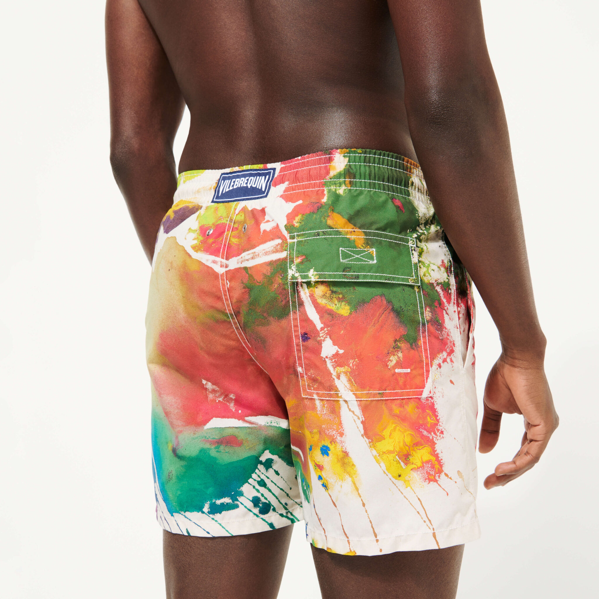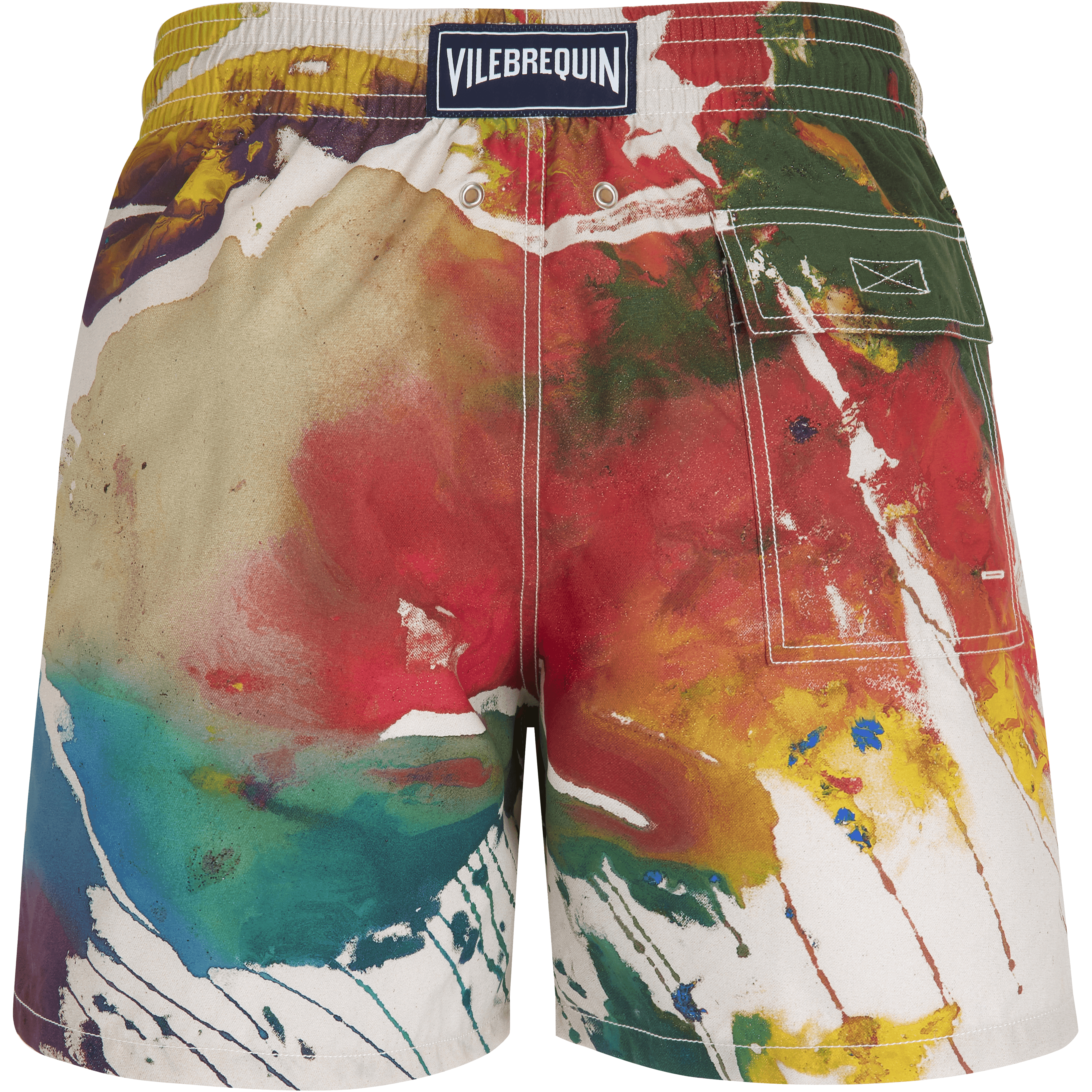 - Swimwear back pocket placed by hand for perfect print alignment.