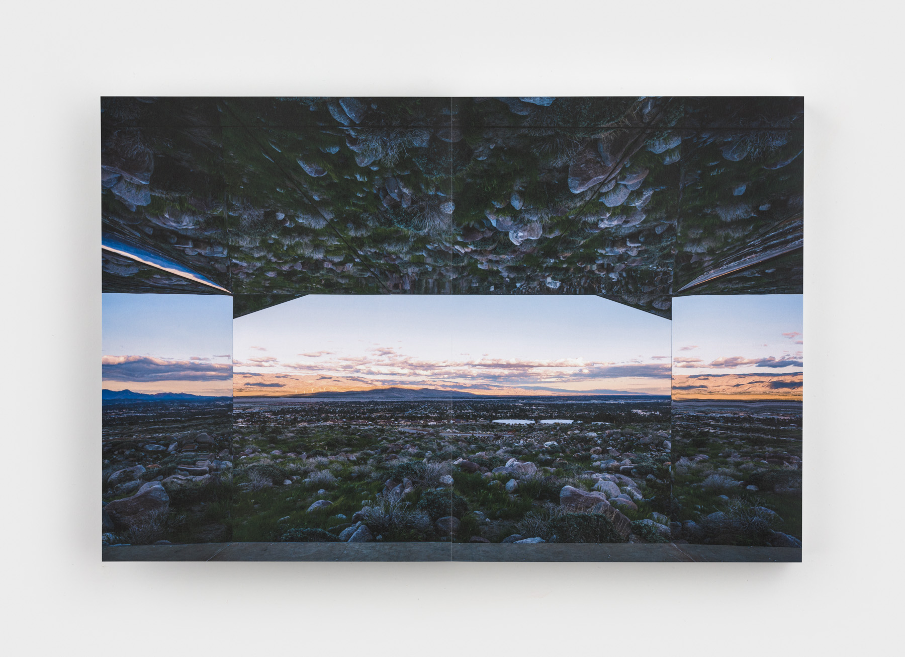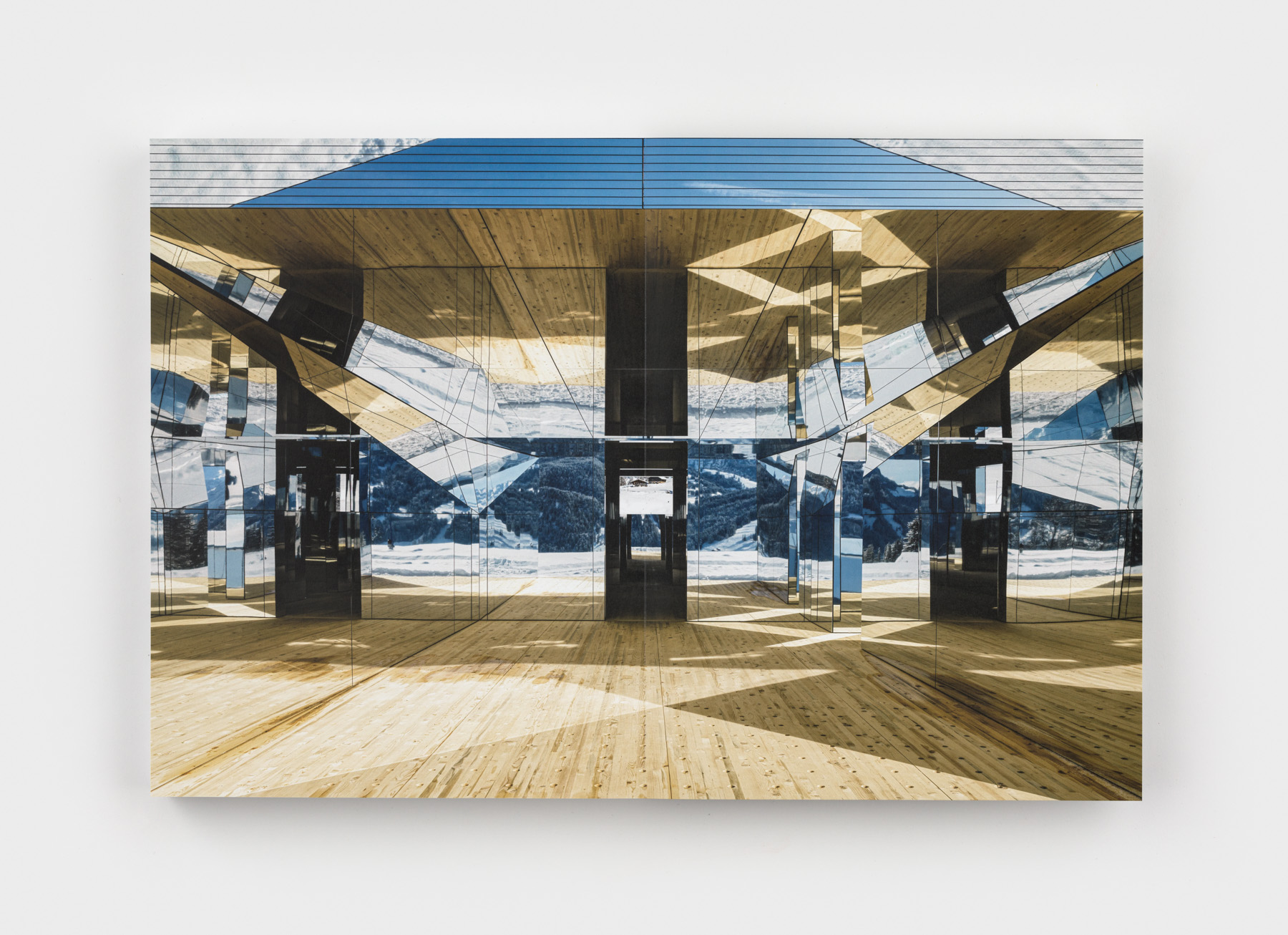 A site-specific installation successively exhibited in the California desert outside Palm Springs, a defunct Detroit bank, and the Alpine landscape of Gstaad, Mirage is inspired by the ranch-style suburban American house—informed by the ideas of architect Frank Lloyd Wright—and entirely composed of reflective mirrored surfaces. A visual echo-chamber, its mirrored surfaces form a life-size kaleidoscope that absorbs and reflects the landscape. Subject and object, interior and exterior, the tangible and the ephemeral, the psychological and the physical, built architecture and landscape : each of these oppositional forces are held in constant tension, yet allowed to shift and transform during the passing of time and seasons. Like a human-sized lens, Mirage works to frame and distort the evolving world outside of it. There is no single time to view this work, as each moment provides a new variation: at night the distant lights refract to create a universe of stars; on a tranquil afternoon the sky is transformed into banks of blue fragmented by slices of clouds. There is no fixed perspective or correct interpretation. Each experience of this living artwork is unique. “I’m interested in the viewer seeing themselves in the work,” Aitken says about his installation, which also dialogues with the history of the Land art.
