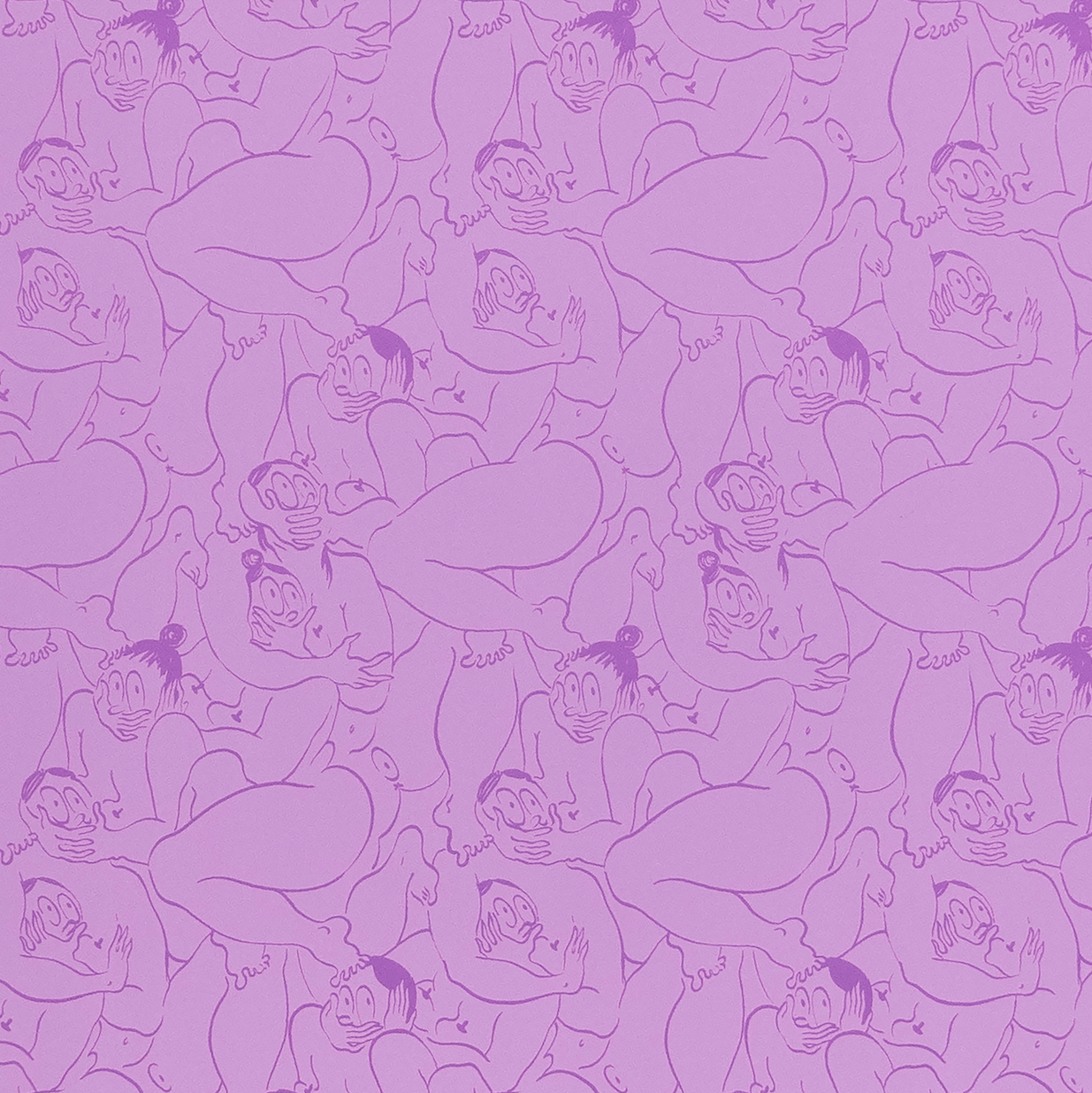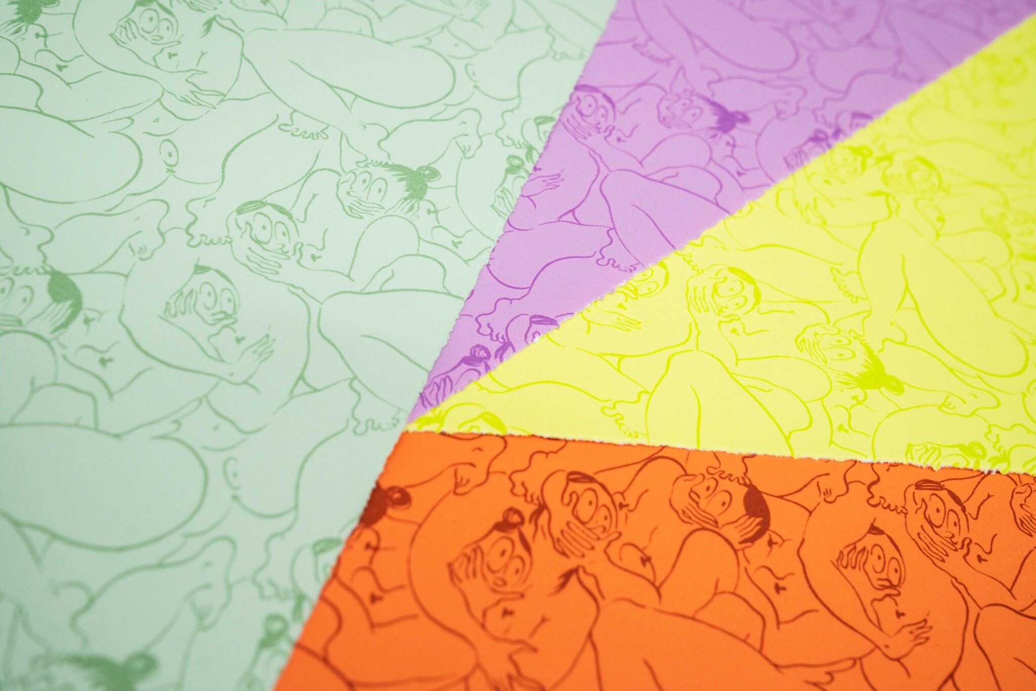 Ebecho Muslimova has gained recognition for the depiction of her alter ego FATEBE, a plump and exuberant personality who subsumes the neuroses and anxieties of her creator. This character has allowed her to explore a diverse range of issues related to the depiction of the body – particularly the female one. Set in fantastical painted landscapes or rendered solo in flowing brushwork, Fatebe explodes the social expectations of the female body through brazen displays of sexuality, vulnerability, and humour. If Fatebe is usually represented only once in each of the artist’s composition, in the series of pattern lithographs, it is not one but hundreds of Fatebe that are represented.