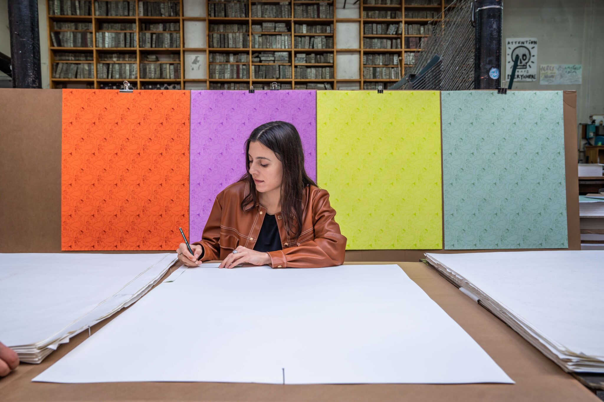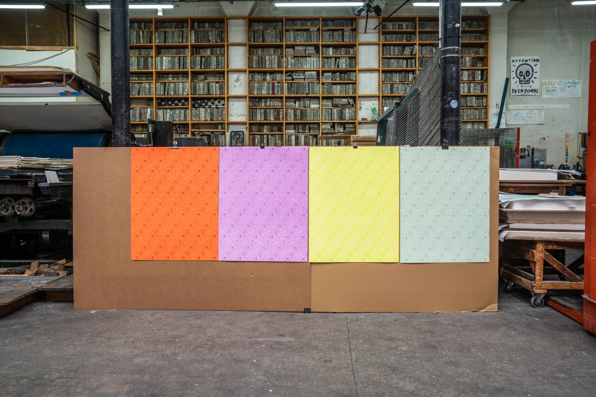 Through its use within large wallpaper installations in institutional settings such as the Belgrade Biennale and the Renaissance Society in Chicago, this motif has become her most iconic. For the first time, Muslimova has transformed it into a lithograph existing in 4 color ways, blurring the lines of her practice.