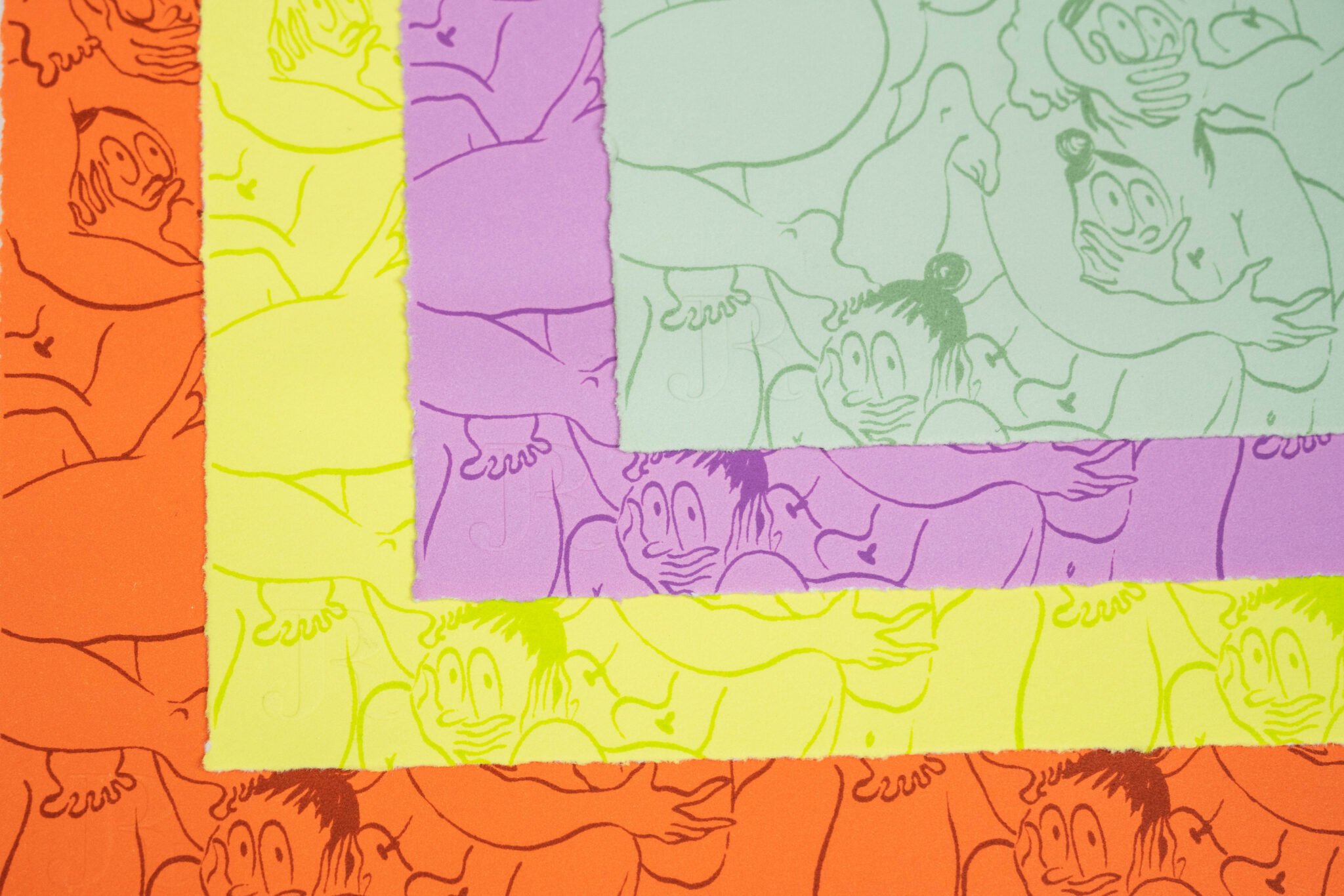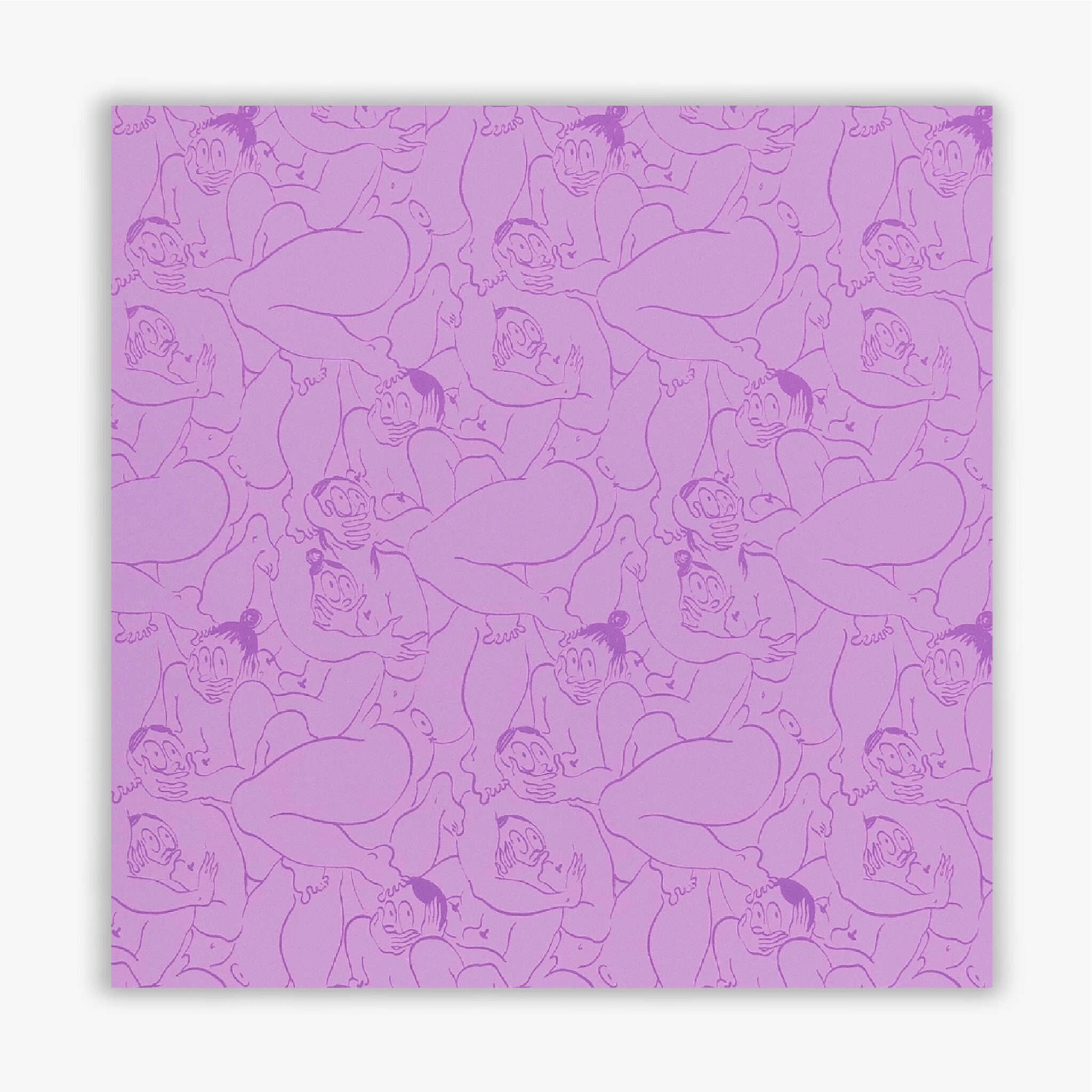 Ebecho Muslimova has gained recognition for the depiction of her alter ego FATEBE, a plump and exuberant personality who subsumes the neuroses and anxieties of her creator. This character has allowed her to explore a diverse range of issues related to the depiction of the body – particularly the female one. Set in fantastical painted landscapes or rendered solo in flowing brushwork, Fatebe explodes the social expectations of the female body through brazen displays of sexuality, vulnerability, and humour. If Fatebe is usually represented only once in each of the artist’s composition, in the series of pattern lithographs, it is not one but hundreds of Fatebe that are represented.