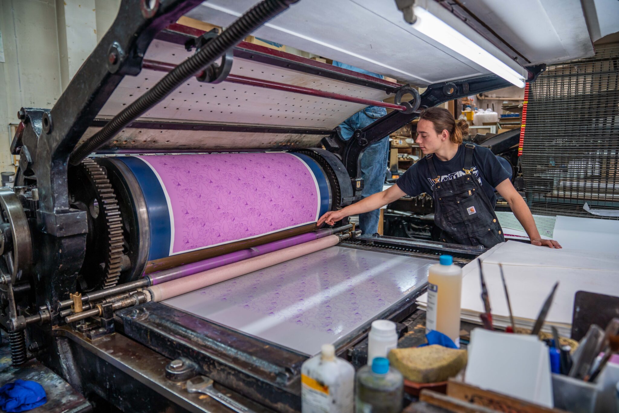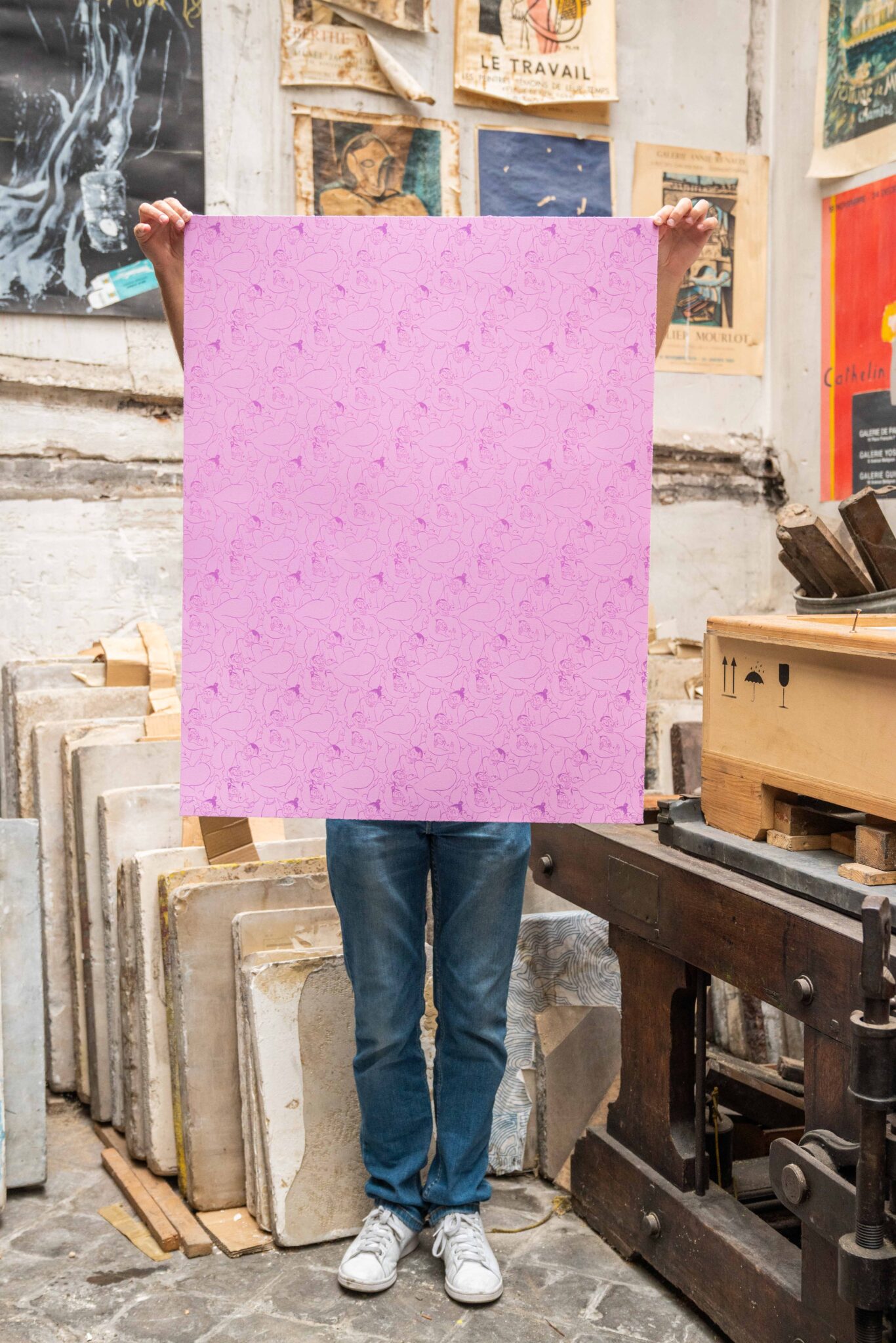 Through its use within large wallpaper installations in institutional settings such as the Belgrade Biennale and the Renaissance Society in Chicago, this motif has become her most iconic. For the first time, Muslimova has transformed it into a lithograph existing in 4 color ways, blurring the lines of her practice.