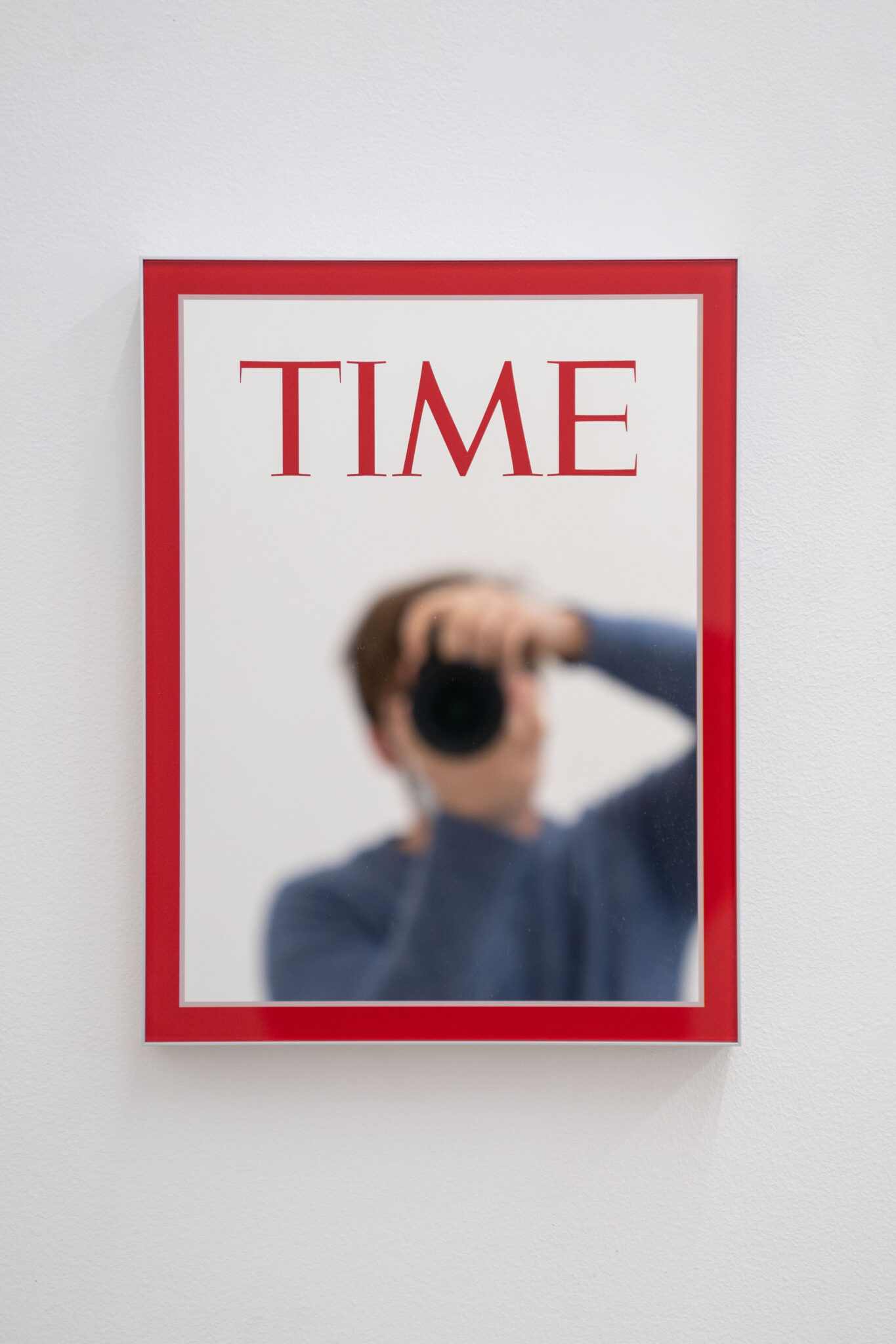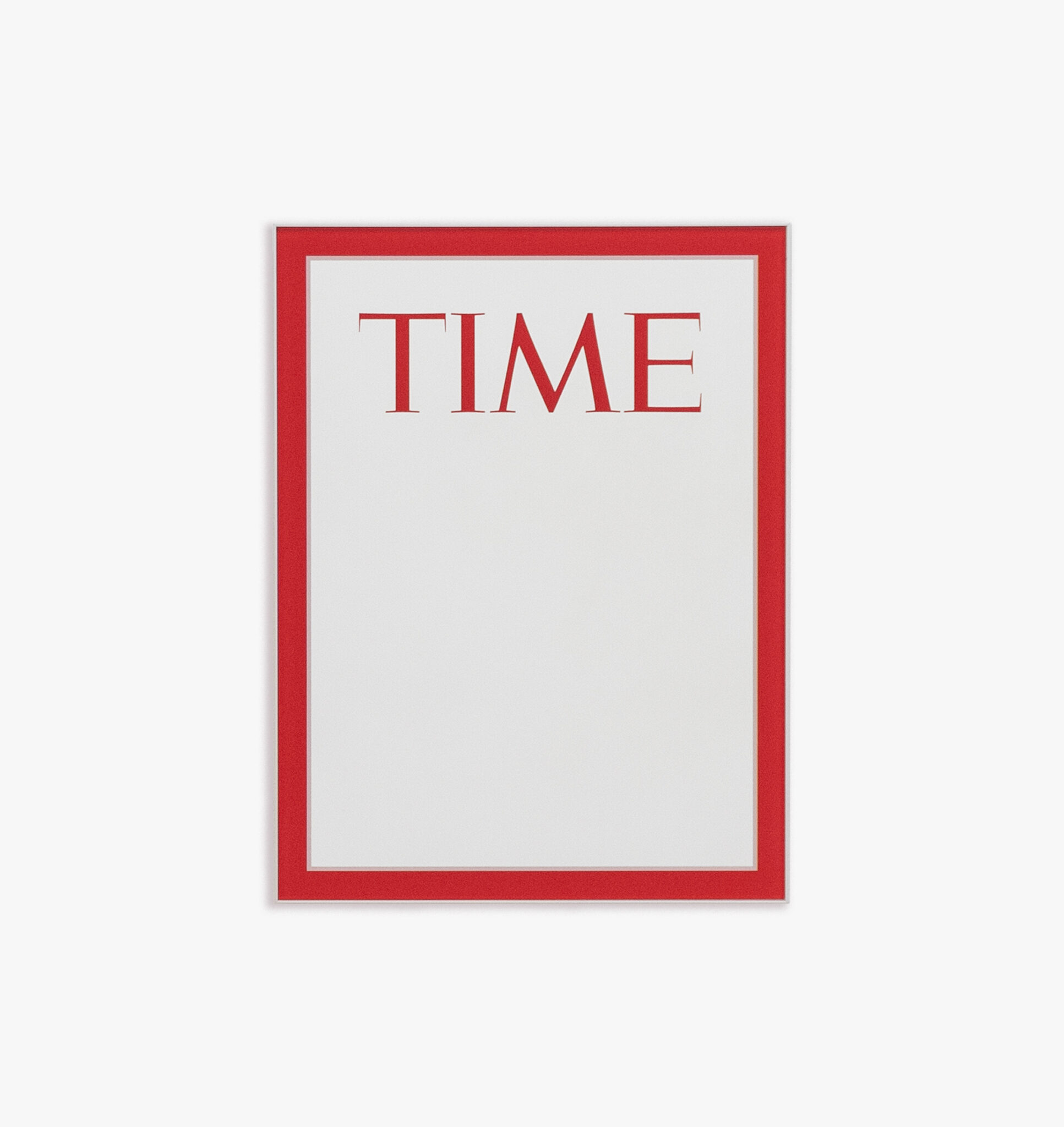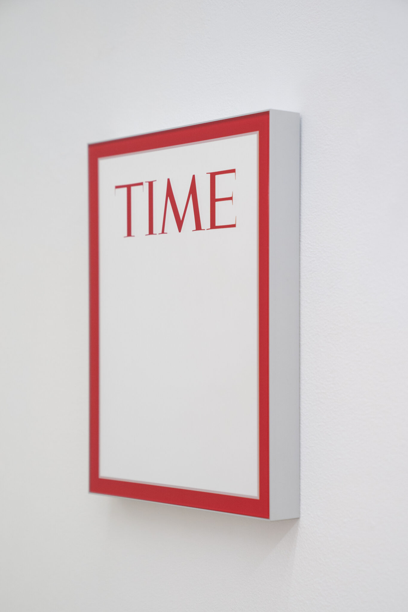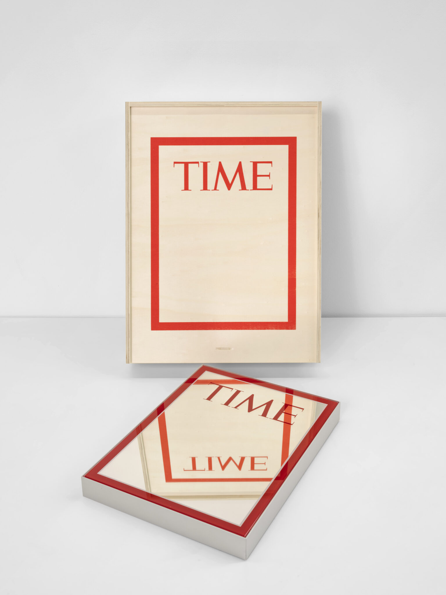 Thomson’s signature TIME mirrors, person-sized silkscreened mirrors bearing the red border and logo of the 100-year-old international weekly newsmagazine, pair a precise historical moment with the viewer’s own reflection in the present. As a series these works form their own archive, reflecting each other, and picturing the viewer within an infinity room of culture and politics and media and design.
