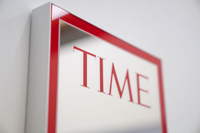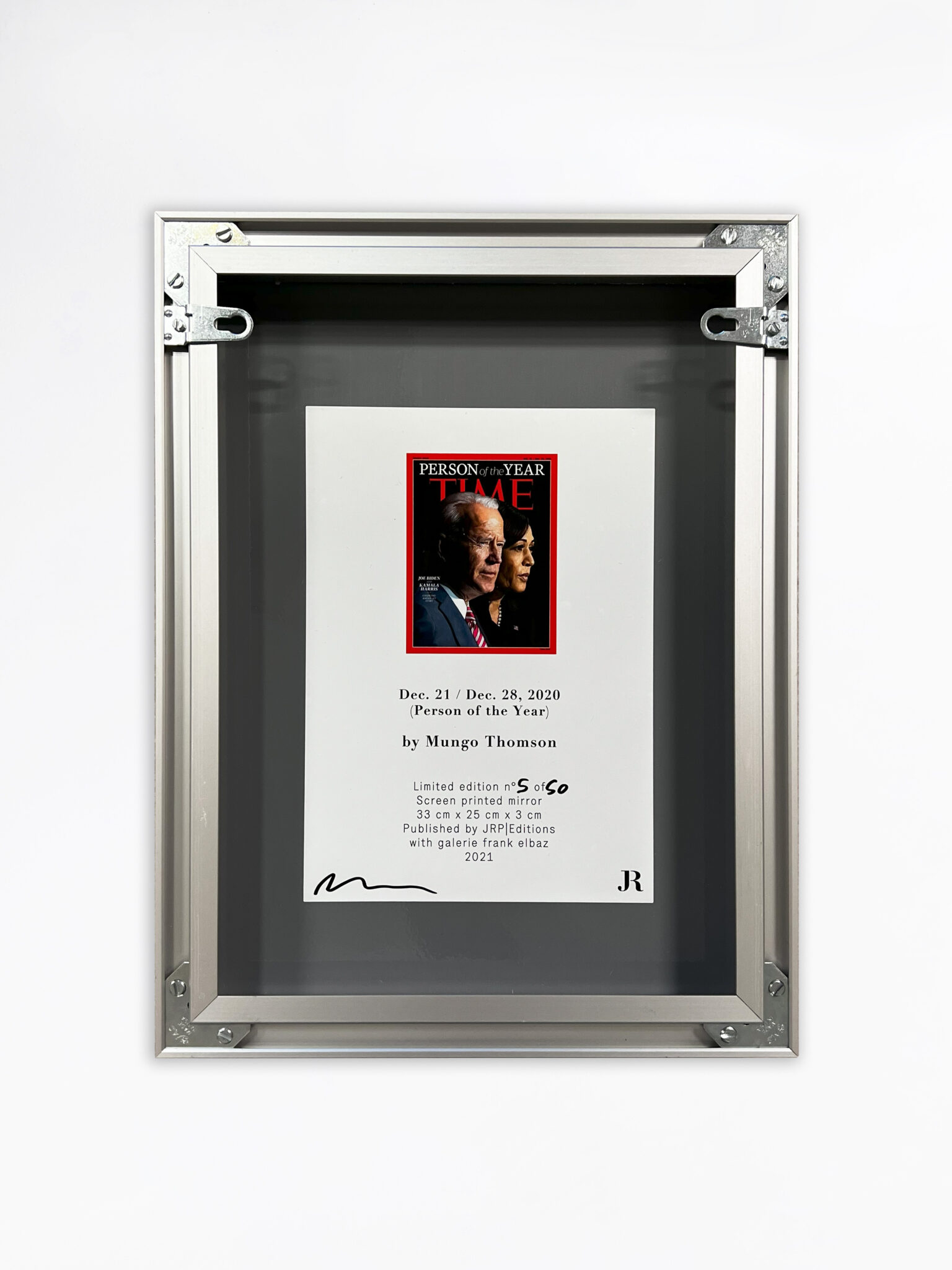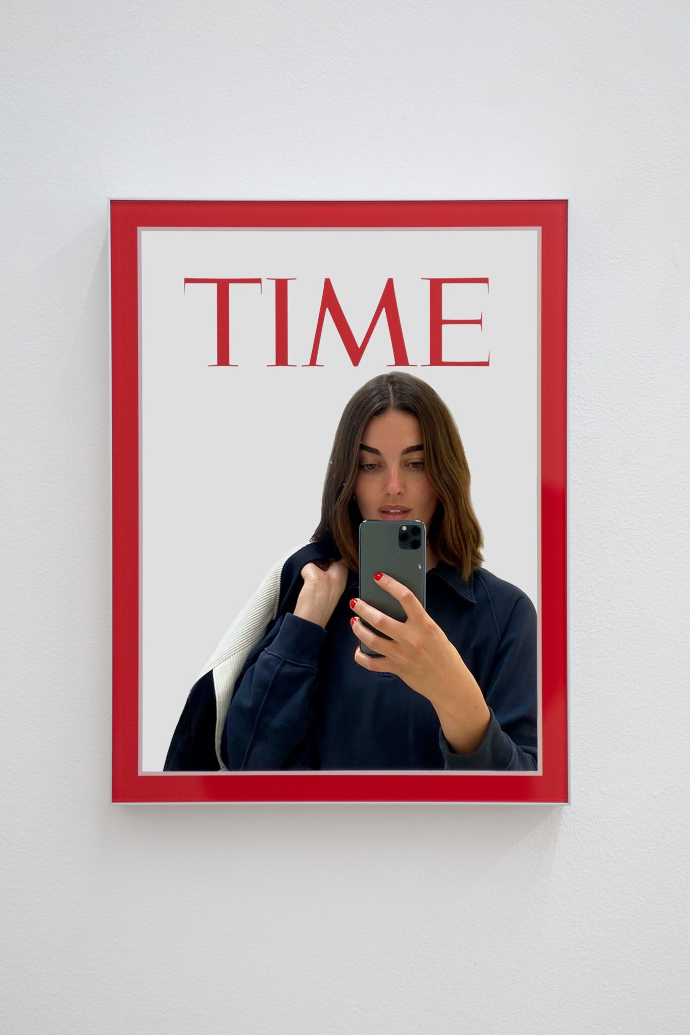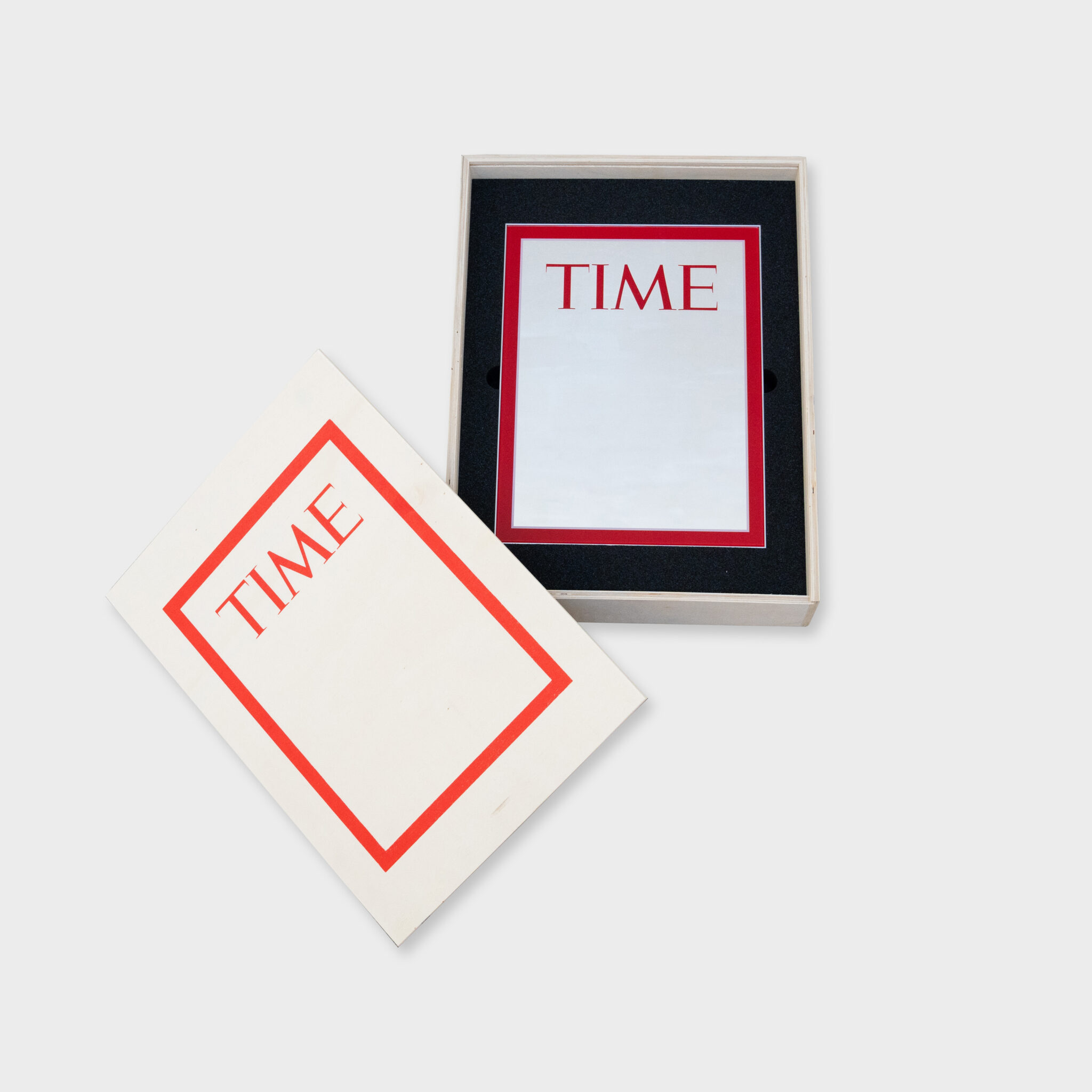 Thomson’s signature TIME mirrors, person-sized silkscreened mirrors bearing the red border and logo of the 100-year-old international weekly newsmagazine, pair a precise historical moment with the viewer’s own reflection in the present. As a series these works form their own archive, reflecting each other, and picturing the viewer within an infinity room of culture and politics and media and design.