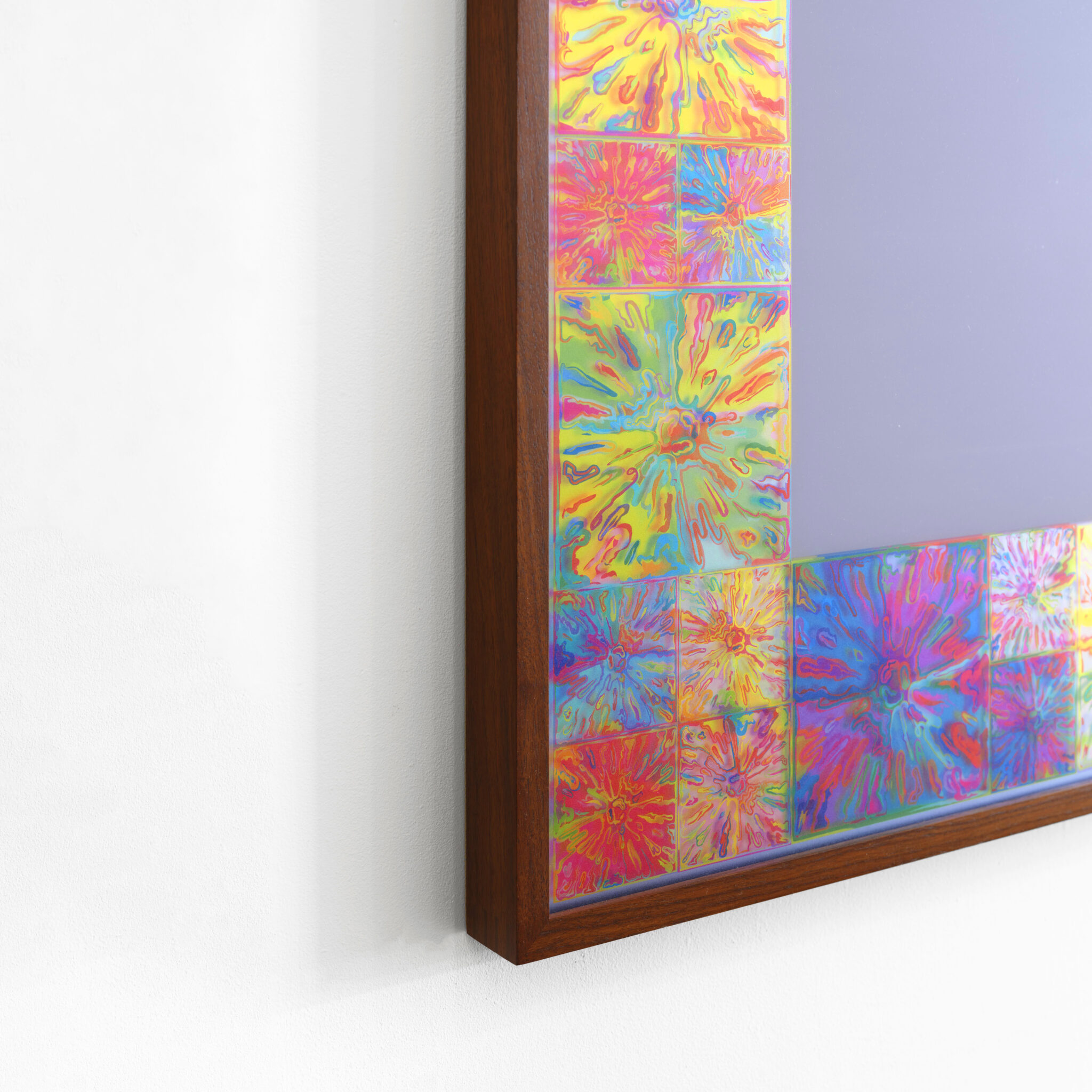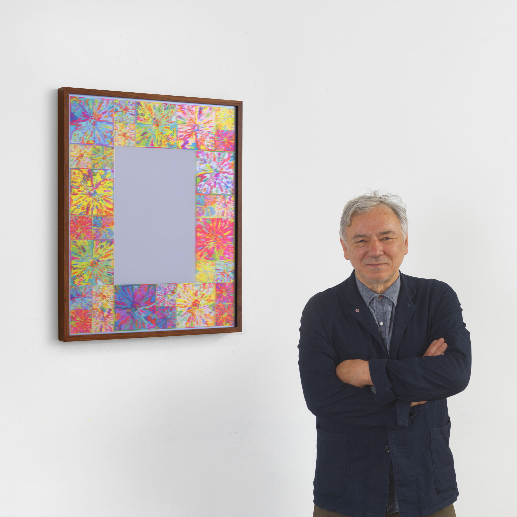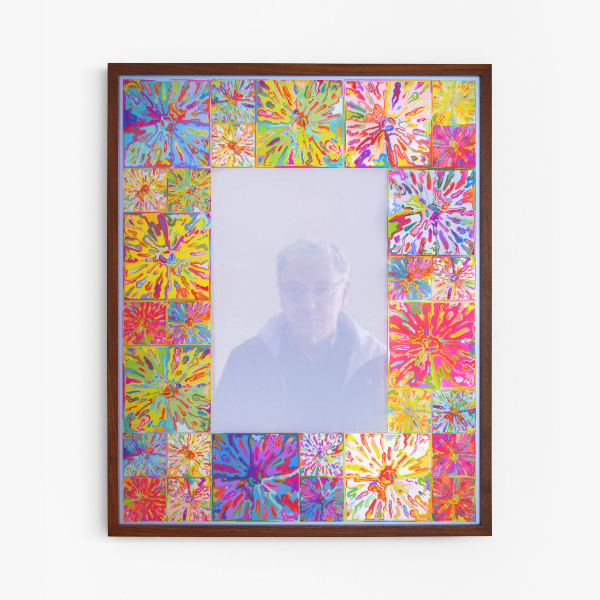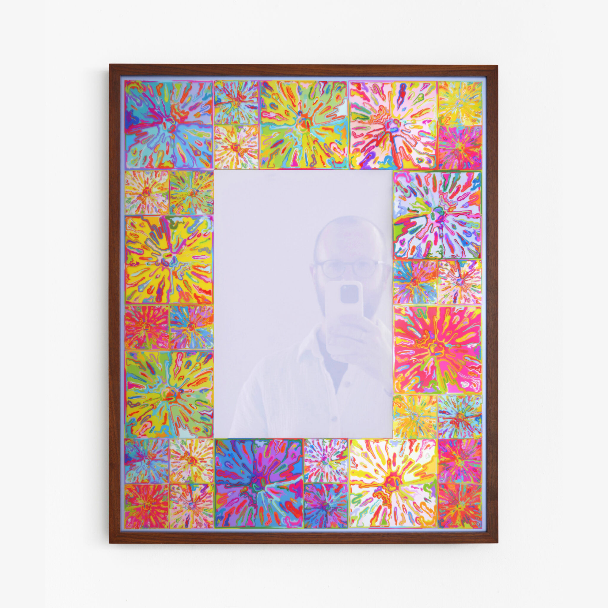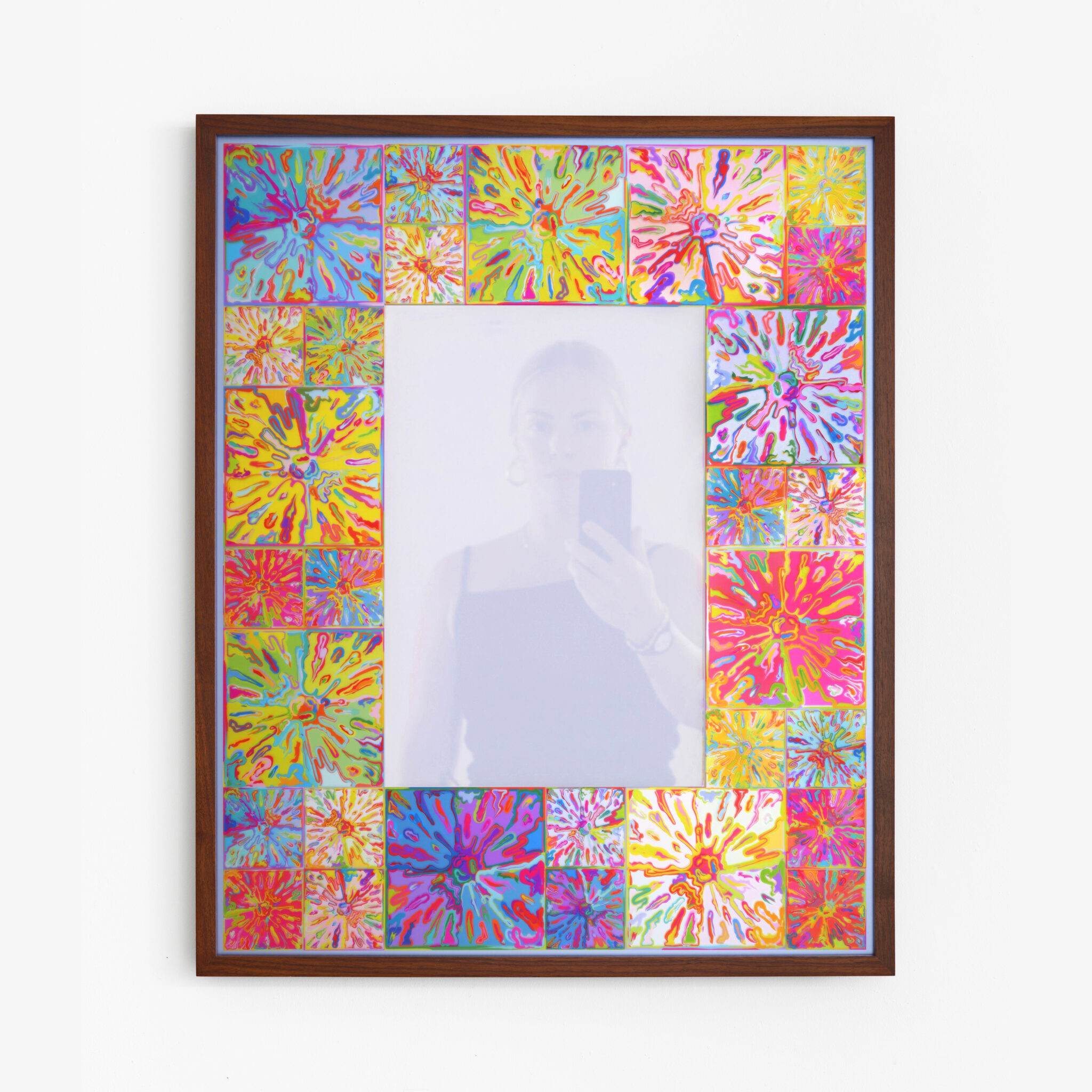 In Mirror, Mirror, Halley’s border incorporates the repeated image of a cartoon-like explosion – a motif that the artist first began to use in the early 1990s. Here it is digitally printed directly on the mirror’s border, yielding a kaleidoscopic frame of brilliant color. The mirror itself has been coated with a silkscreened layer of translucent lavender blurring the viewer’s reflection, creating a ghostly effect inspired by the otherworldly reflection of the king and queen in the mirror in Velasquez’s Las Meninas.