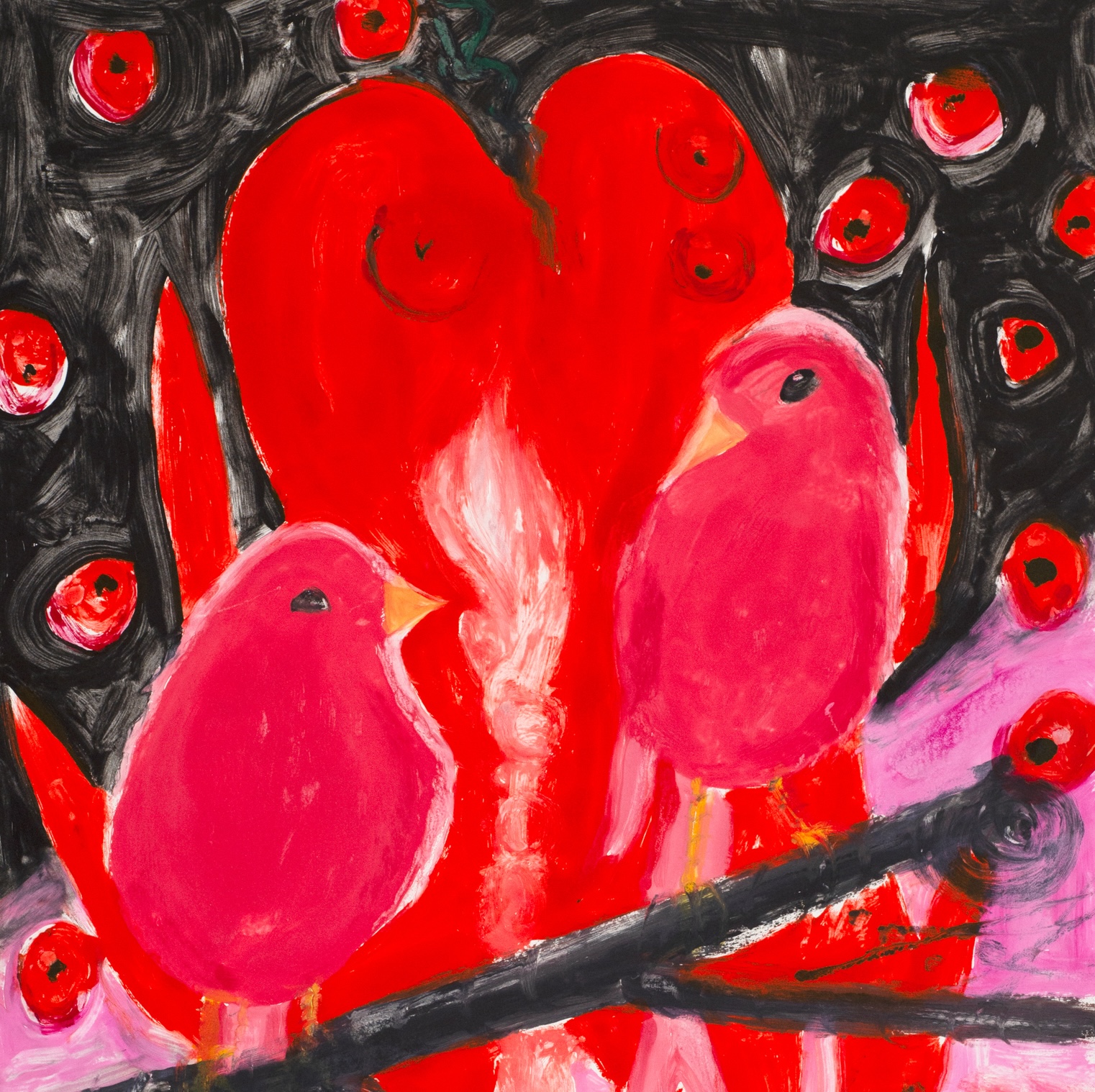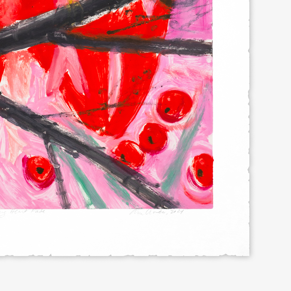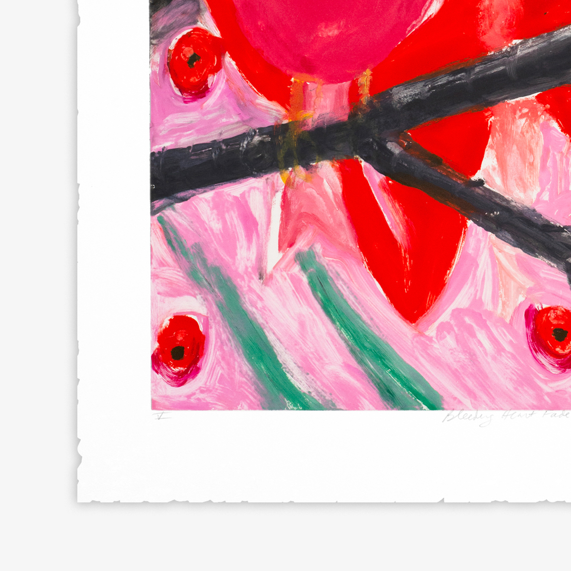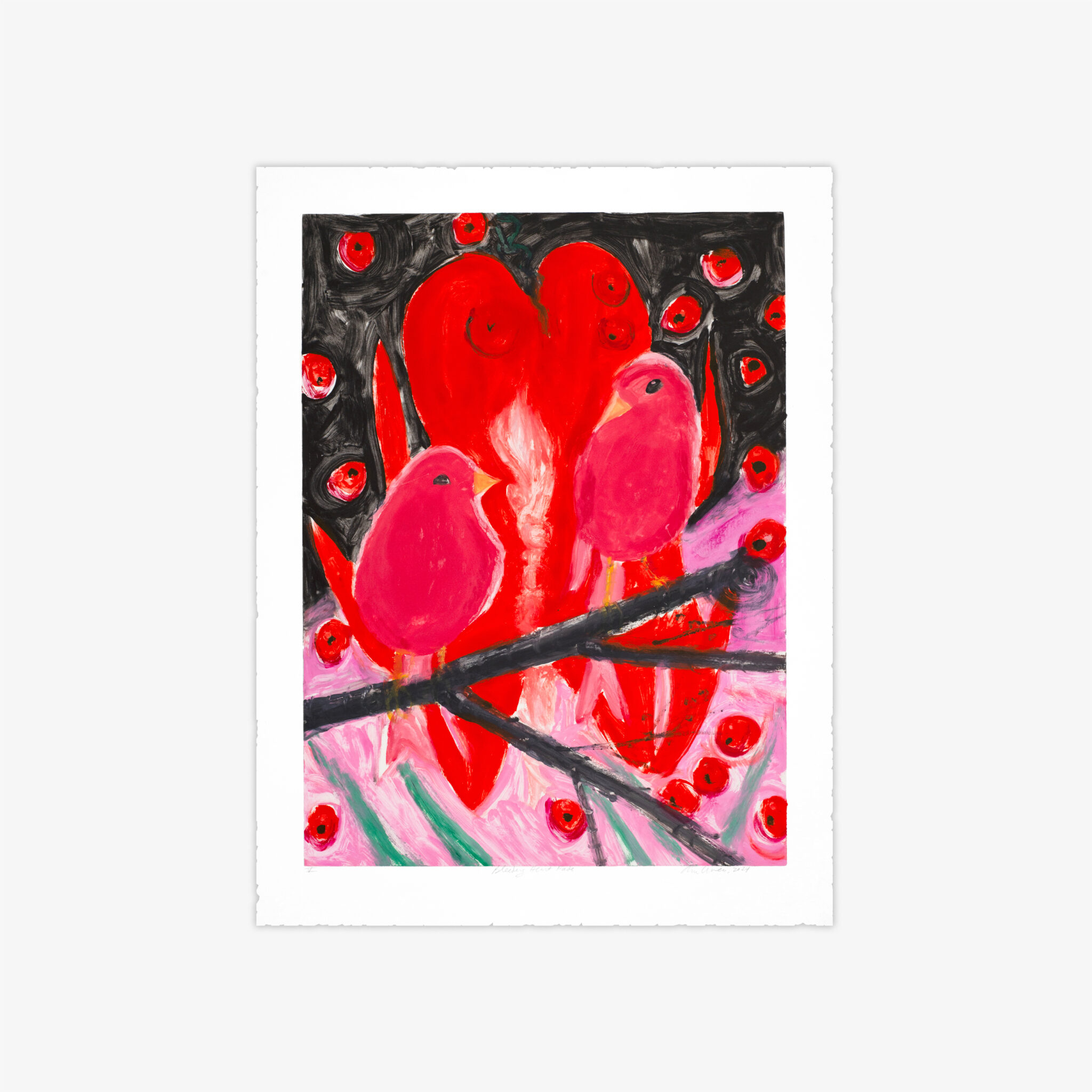 This unique series of 12 monotypes made by Ann Craven entitled, Bleeding Heart Fade, is based on a painting that the artist has recently revisited.  The birds depicted are like an iconic symbol of both devotion and love of family and people in the artist’s life, namely her grandparents.
