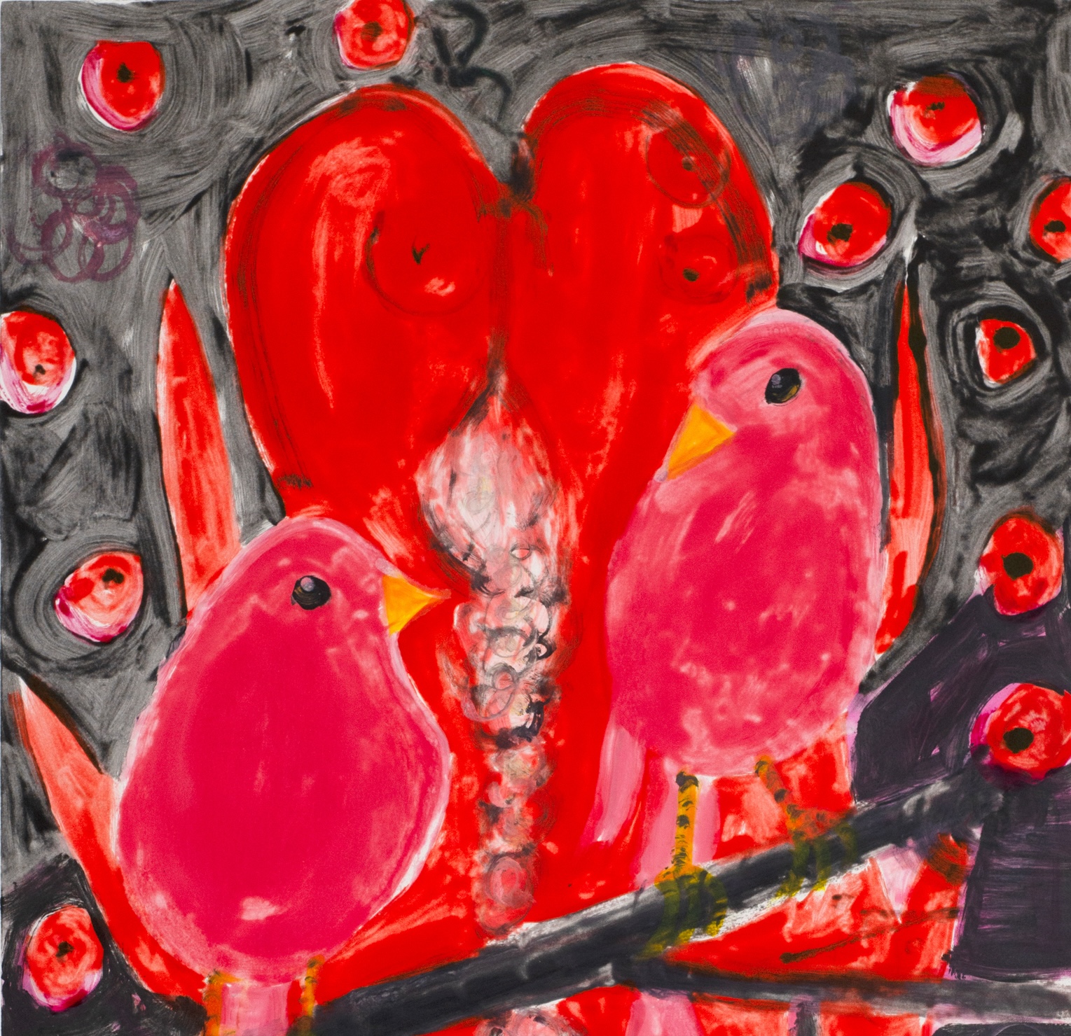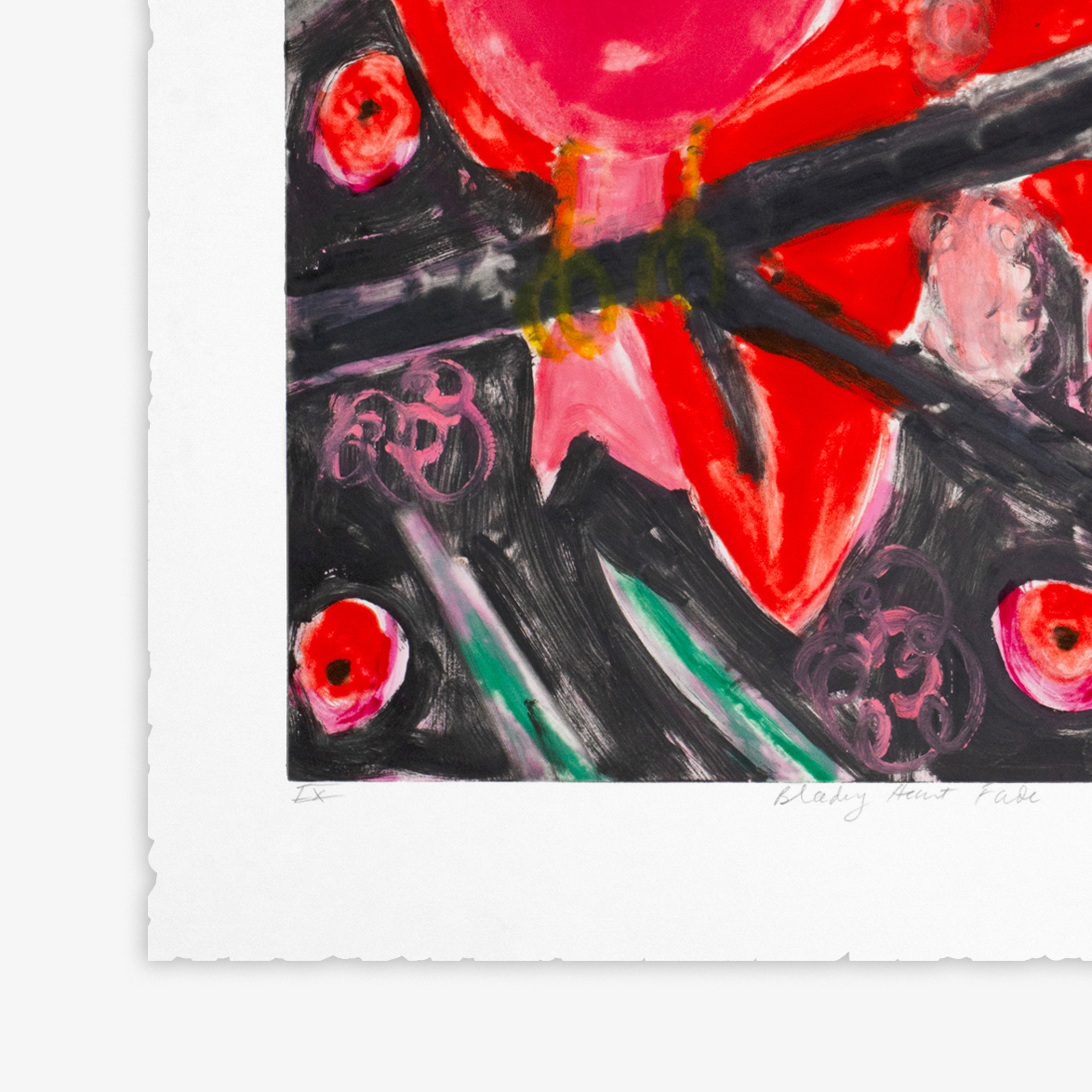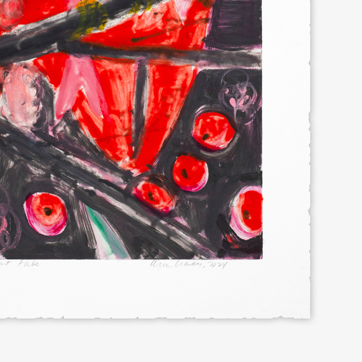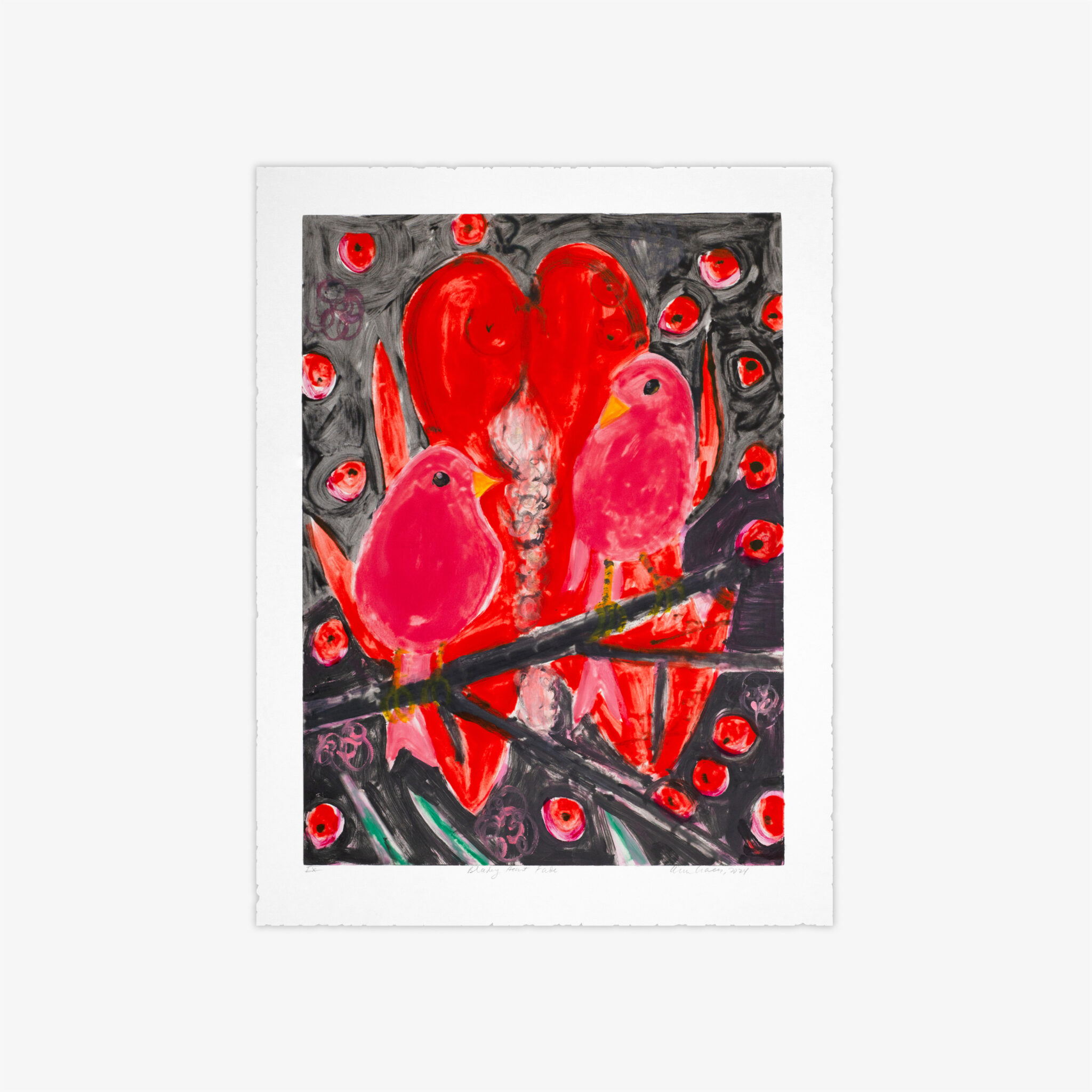 This unique series of 12 monotypes made by Ann Craven entitled, Bleeding Heart Fade, is based on a painting that the artist has recently revisited.  The birds depicted are like an iconic symbol of both devotion and love of family and people in the artist’s life, namely her grandparents.