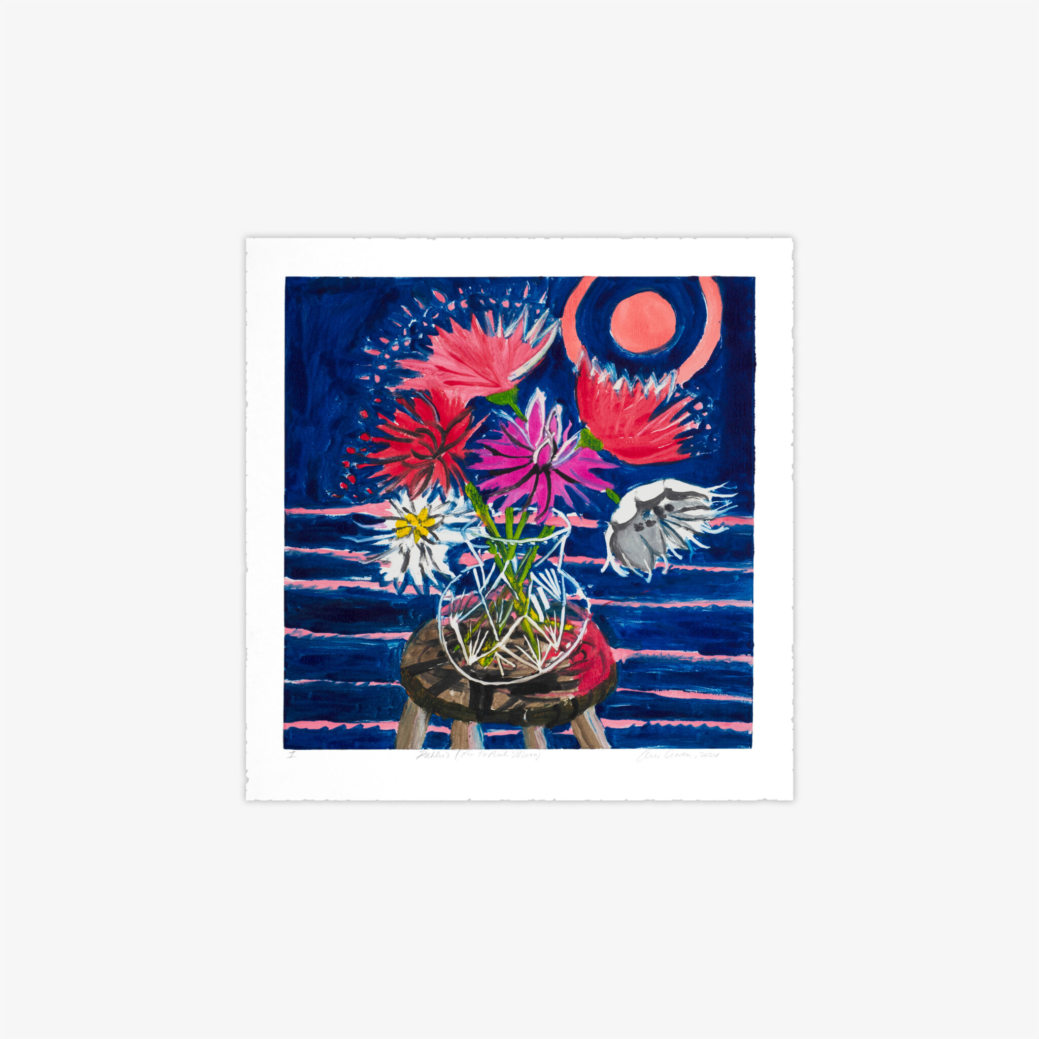 This unique series of 11 monotypes entitled Dahlia’s (For the Pink Moon) capture moments rooted in the artist’s memories, personal experiences, and inspirations. Whenever Craven paints flowers they are depicted in one of her mother’s crystal vases and in these series of prints the vase sits on top of a stool with a background of the moon rising, an ever-present symbol in the artist’s lexicon.