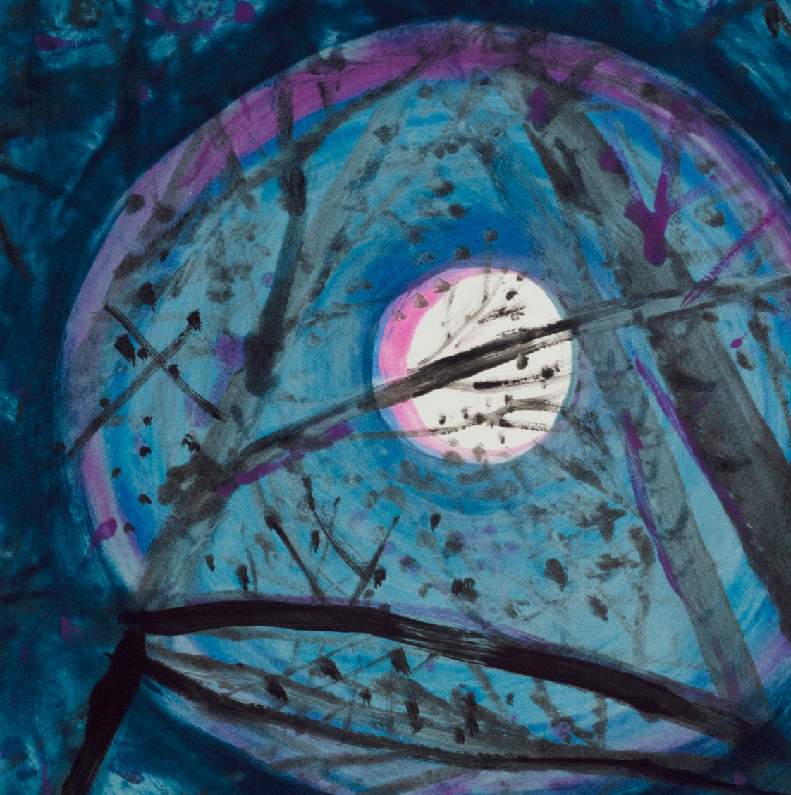 Like a mantra prayer, the moon repeats it’s presence, but never stays the same. This particular moon with a ring around it is described by the artist as a lover’s moon — “When you look up at the night sky and see a ring around the moon and are lucky enough to see a color between the moon and the ring, it sets off a feeling inside of universal love and everybody seeing that moon is simultaneously experiencing that love.”