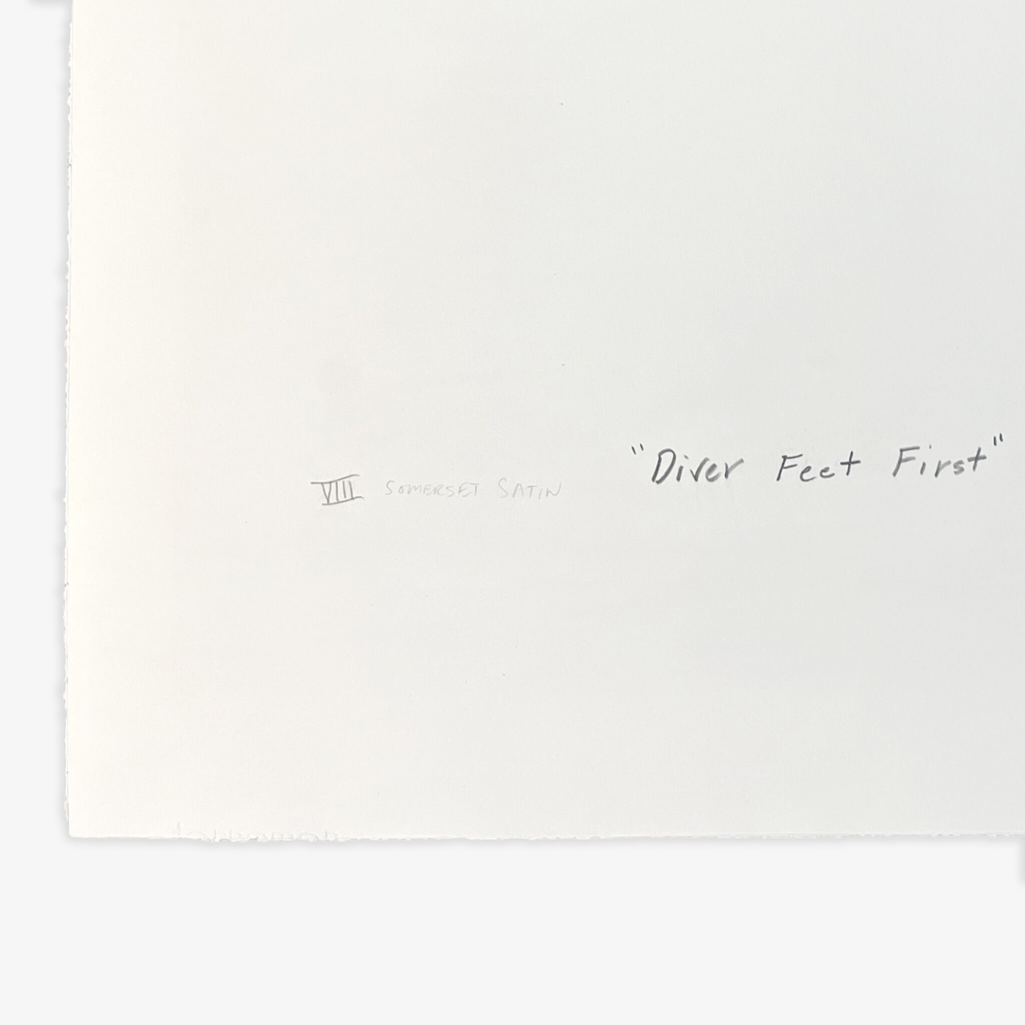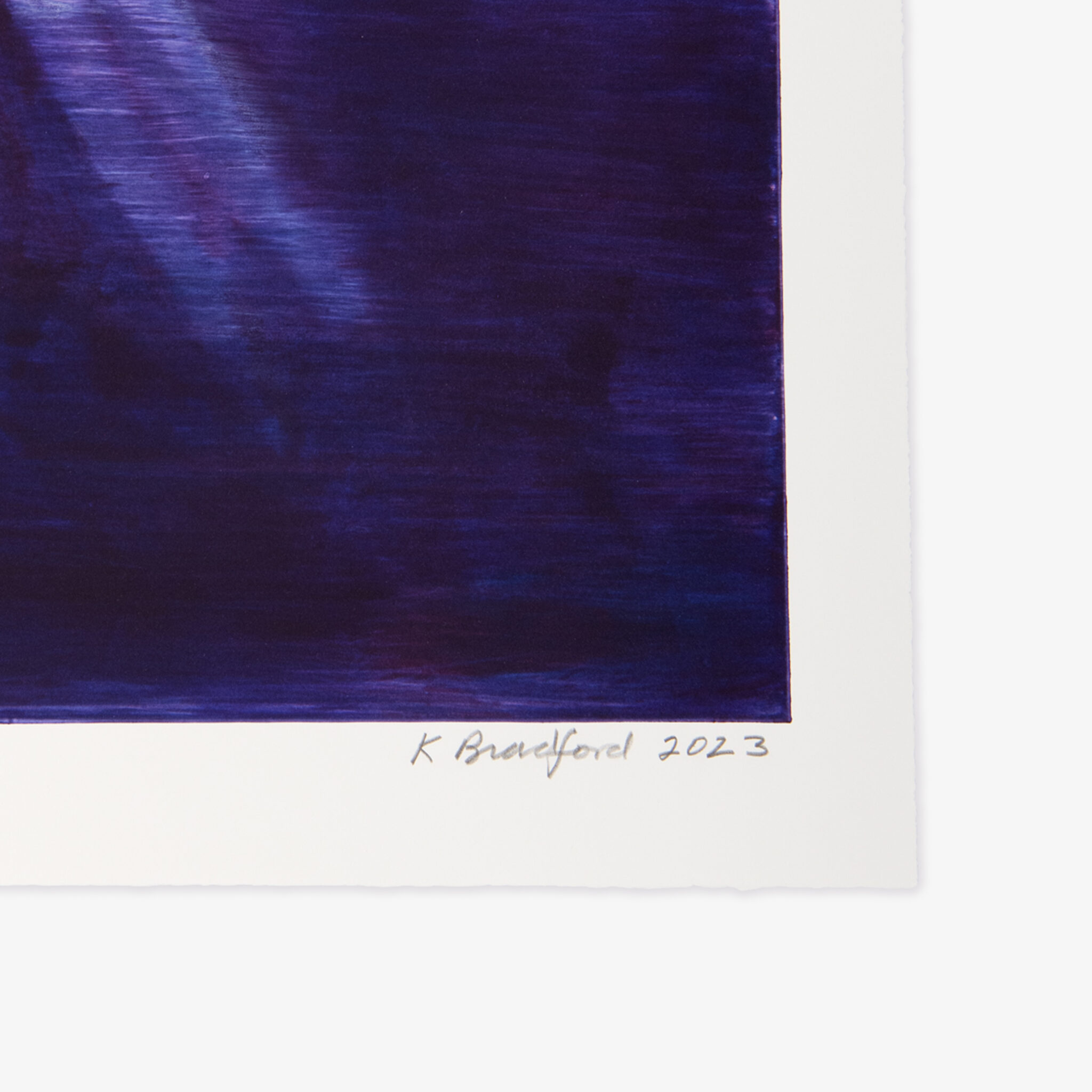 For her first occasion working with the monotype medium, Katherine Bradford has created three series of unique prints: Holding Hands, Diver Feet First, and Dock Diver. Bradford is singularly well-suited to making monotypes, as a painter with an intuitive sense of color, bold mark-making, and allusive imagery that transfer from plate to paper with depth and intensity. These series show her spontaneous thinking and making in service to her constant themes of intimacy, water, and risk-taking.