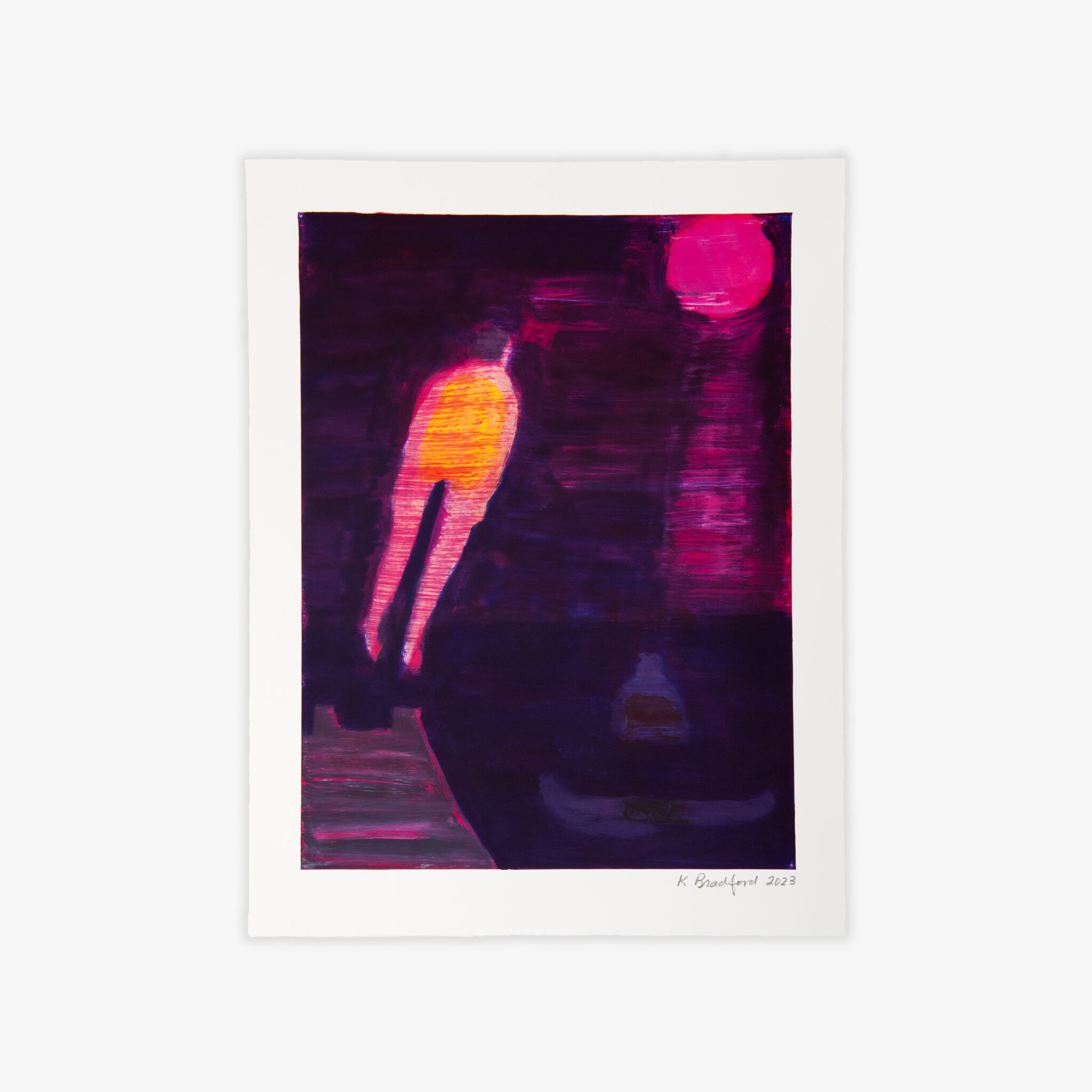 For her first occasion working with the monotype medium, Katherine Bradford has created three series of unique prints: Holding Hands, Diver Feet First, and Dock Diver. Bradford is singularly well-suited to making monotypes, as a painter with an intuitive sense of color, bold mark-making, and allusive imagery that transfer from plate to paper with depth and intensity. These series show her spontaneous thinking and making in service to her constant themes of intimacy, water, and risk-taking.