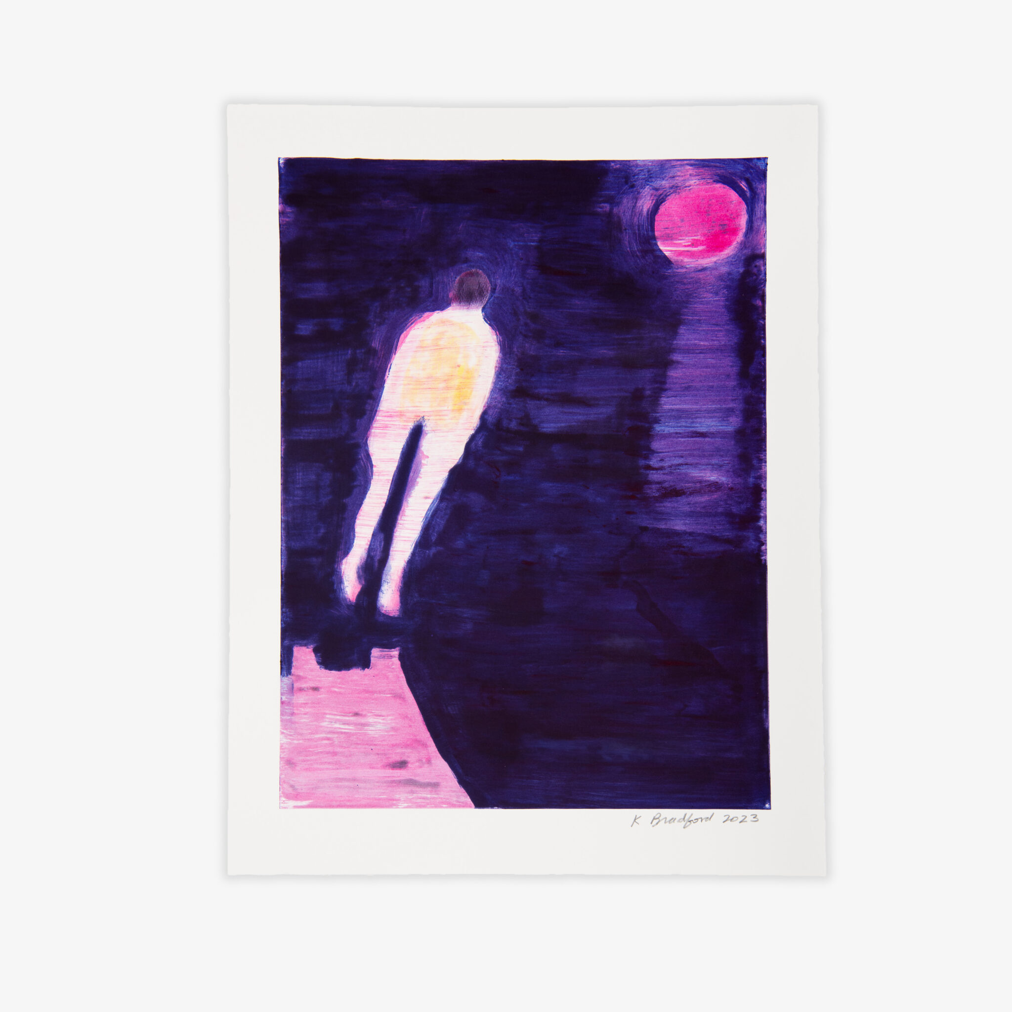 For her first occasion working with the monotype medium, Katherine Bradford has created three series of unique prints: Holding Hands, Diver Feet First, and Dock Diver. Bradford is singularly well-suited to making monotypes, as a painter with an intuitive sense of color, bold mark-making, and allusive imagery that transfer from plate to paper with depth and intensity. These series show her spontaneous thinking and making in service to her constant themes of intimacy, water, and risk-taking.