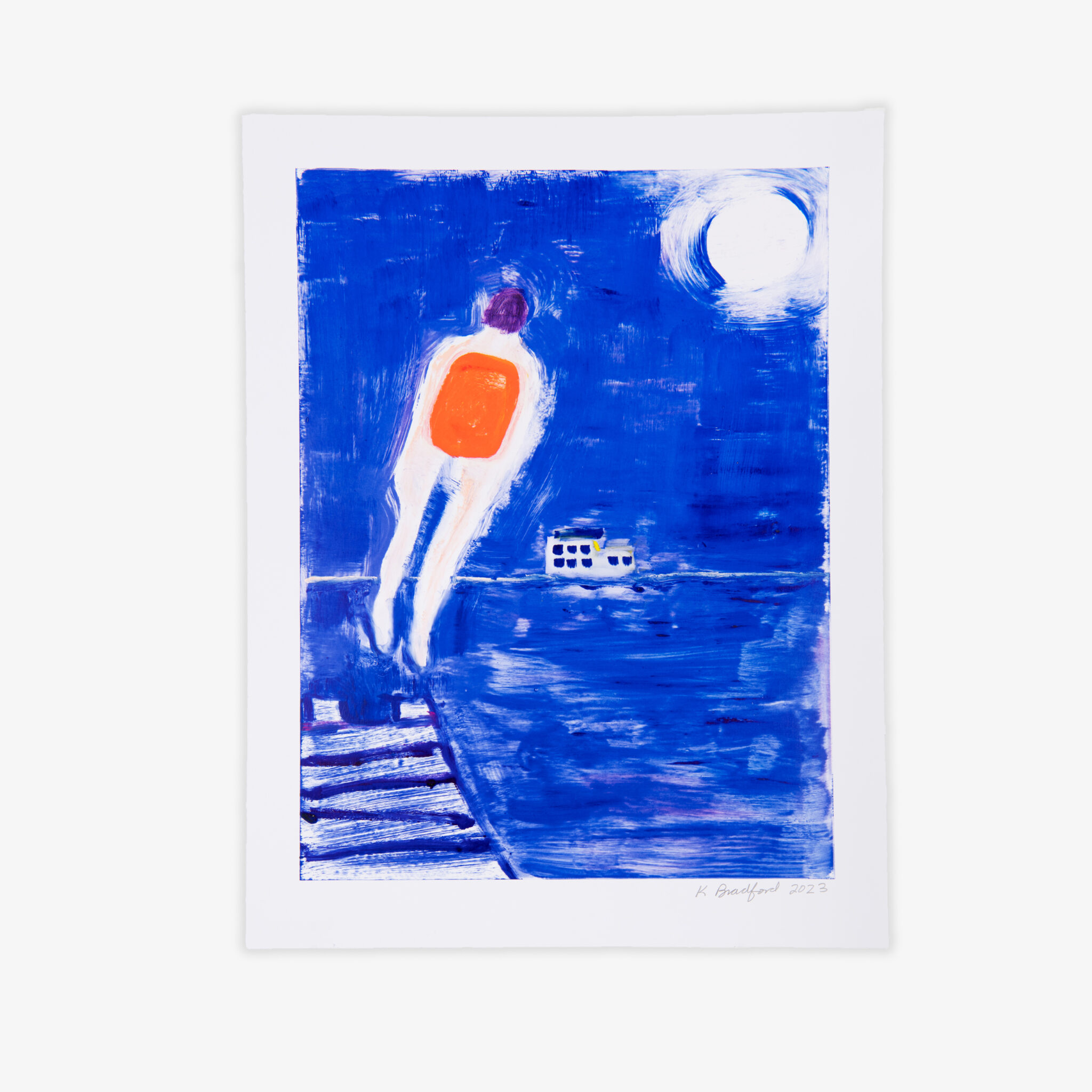 For her first occasion working with the monotype medium, Katherine Bradford has created three series of unique prints: Holding Hands, Diver Feet First, and Dock Diver. Bradford is singularly well-suited to making monotypes, as a painter with an intuitive sense of color, bold mark-making, and allusive imagery that transfer from plate to paper with depth and intensity. These series show her spontaneous thinking and making in service to her constant themes of intimacy, water, and risk-taking.
