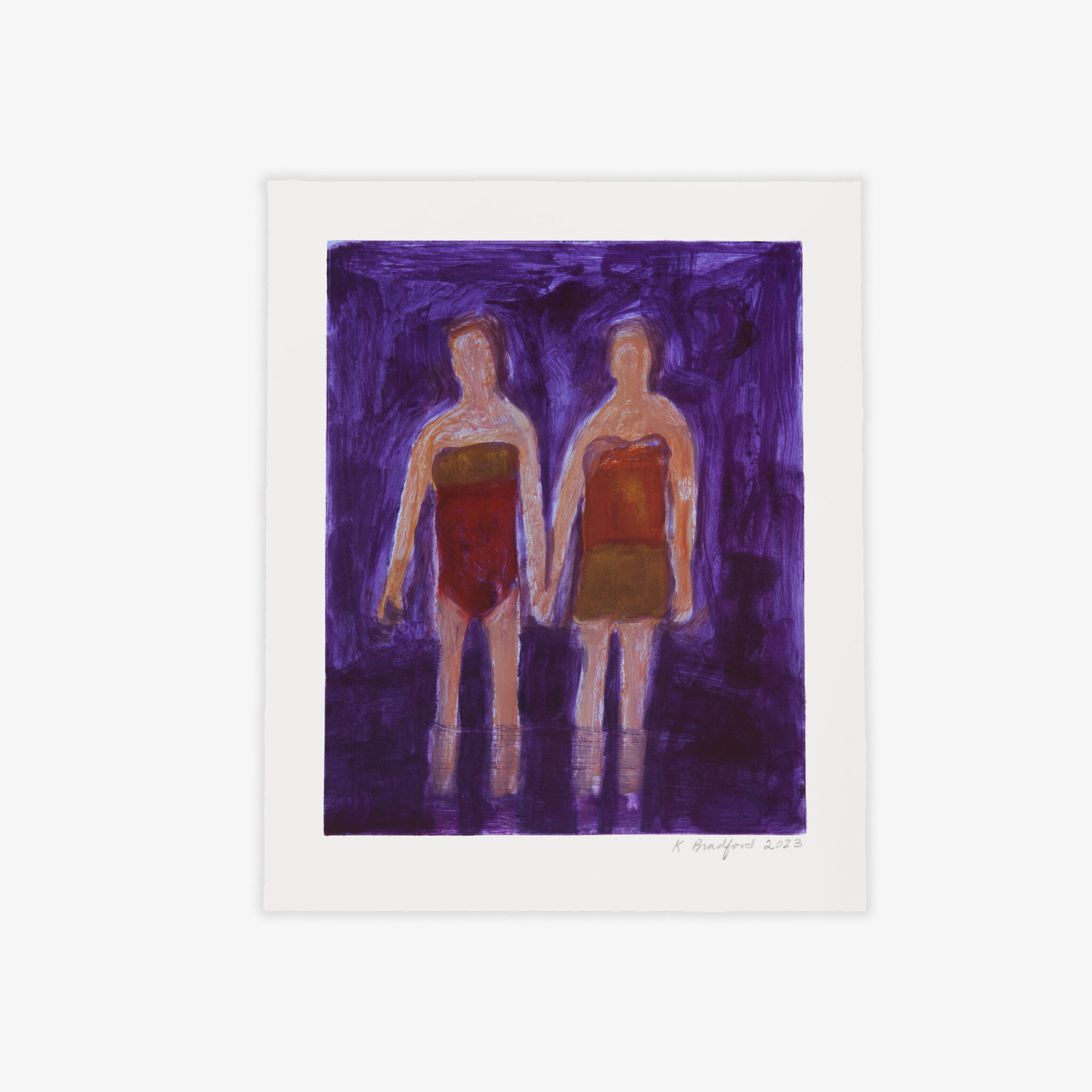 For her first occasion working with the monotype medium, Katherine Bradford has created three series of unique prints: Holding Hands, Diver Feet First, and Dock Diver. Bradford is singularly well-suited to making monotypes, as a painter with an intuitive sense of color, bold mark-making, and allusive imagery that transfer from plate to paper with depth and intensity. These series show her spontaneous thinking and making in service to her constant themes of intimacy, water, and risk-taking.