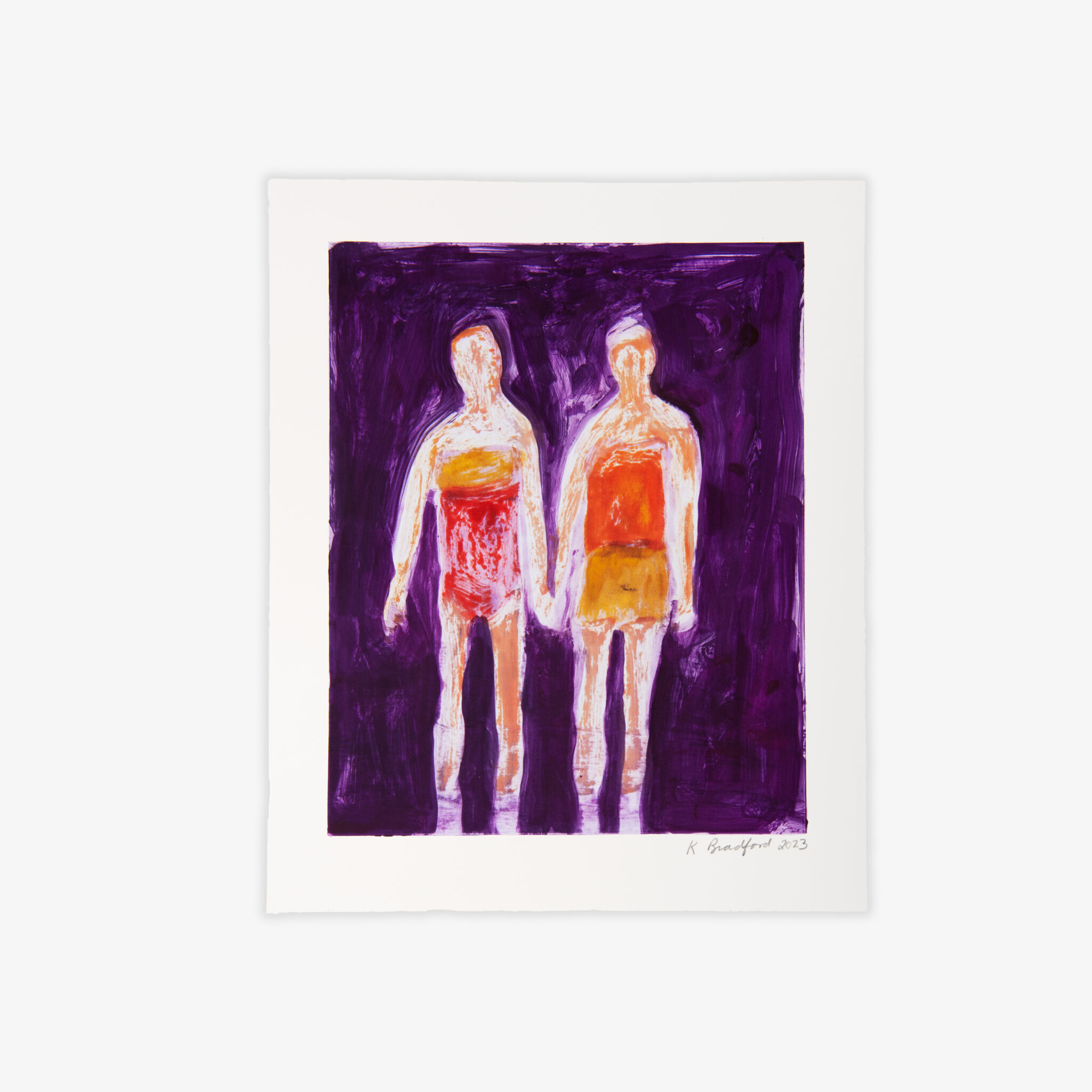 For her first occasion working with the monotype medium, Katherine Bradford has created three series of unique prints: Holding Hands, Diver Feet First, and Dock Diver (all 2024). Bradford is singularly well-suited to making monotypes, as a painter with an intuitive sense of color, bold mark-making, and allusive imagery that transfer from plate to paper with depth and intensity. These series show her spontaneous thinking and making in service to her constant themes of intimacy, water, and risk-taking.