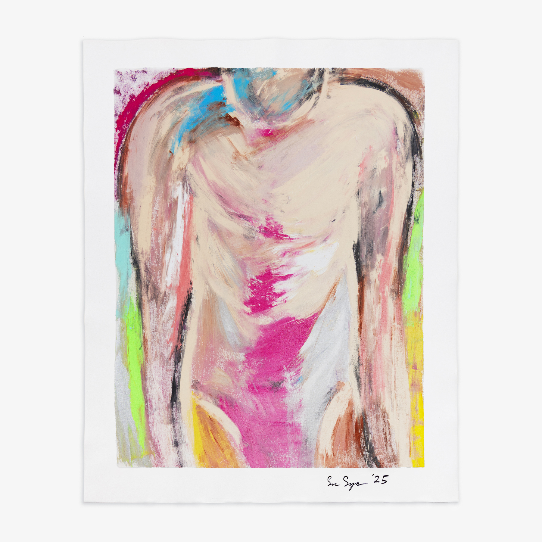 Ser Serpas (b. 1995) produced this series of unique monotypes in rapid succession utilizing vibrant colors in an expressionistic and gestural manner to create an image of a single figure looking down at the ground. The inspiration behind the figure is based on an image the artist generated on the AI platform, Craiyon LLC. The characteristics of the figure are obscured, particularly in the face—its grimacing expression at once intelligible while also not constant and shifting in space as if seen in a dream or hallucination.