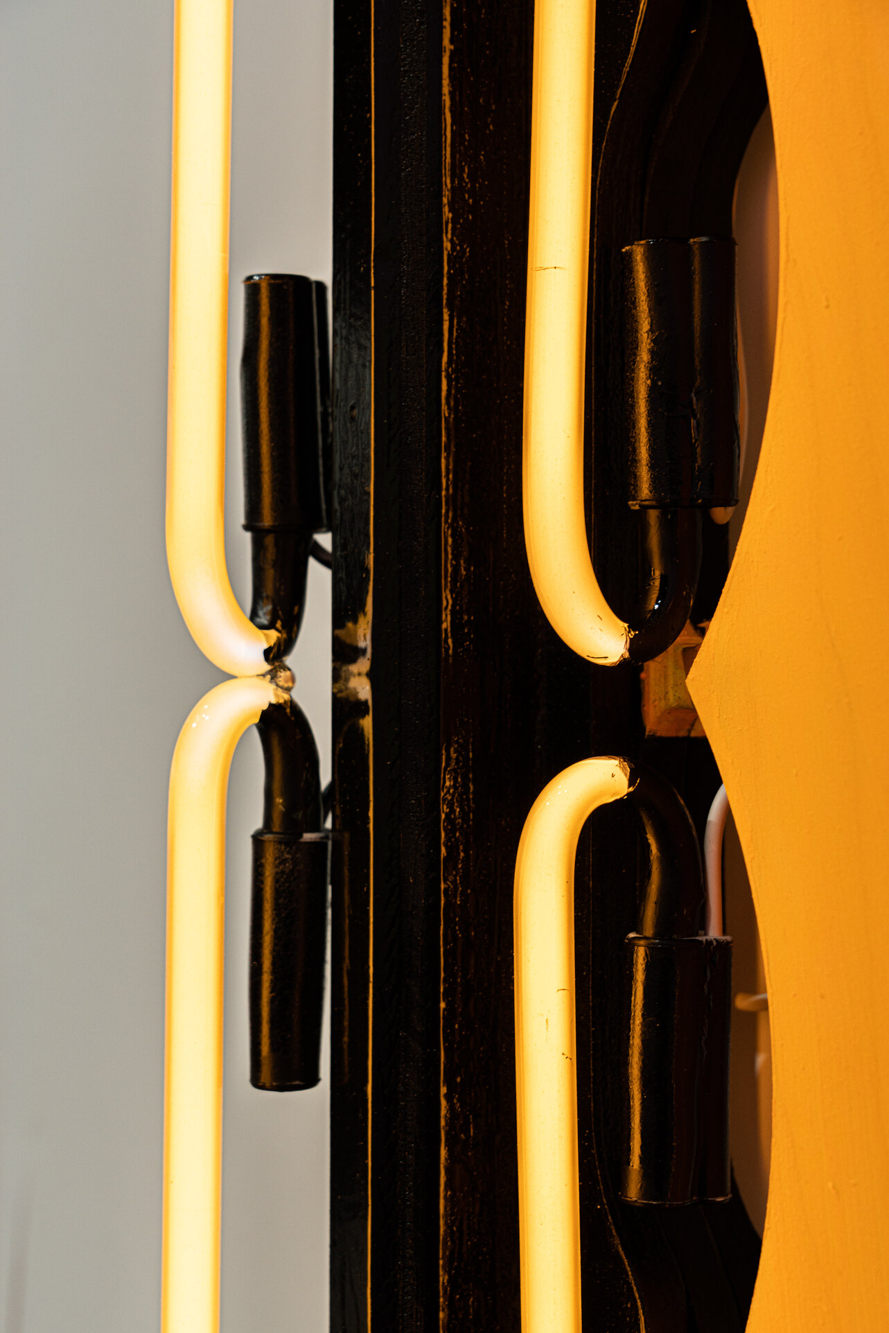 Sashimi Satans (2023) comes from Thurman’s universe of “found forms” including Pop and advertising iconography and references to previous works.  The neon shape is a motif from the artist’s track paintings – in this case the Daytona “D” shaped raceway.