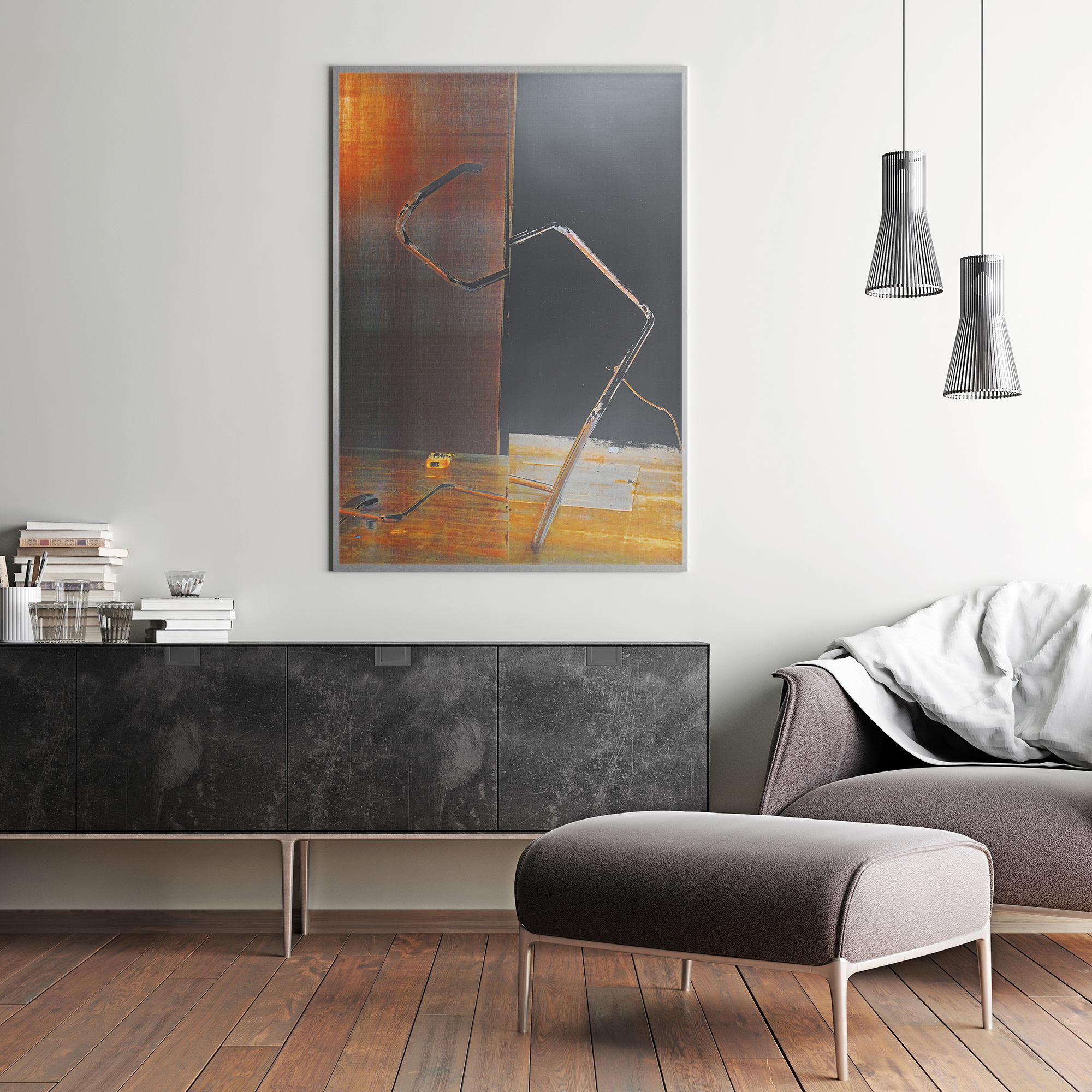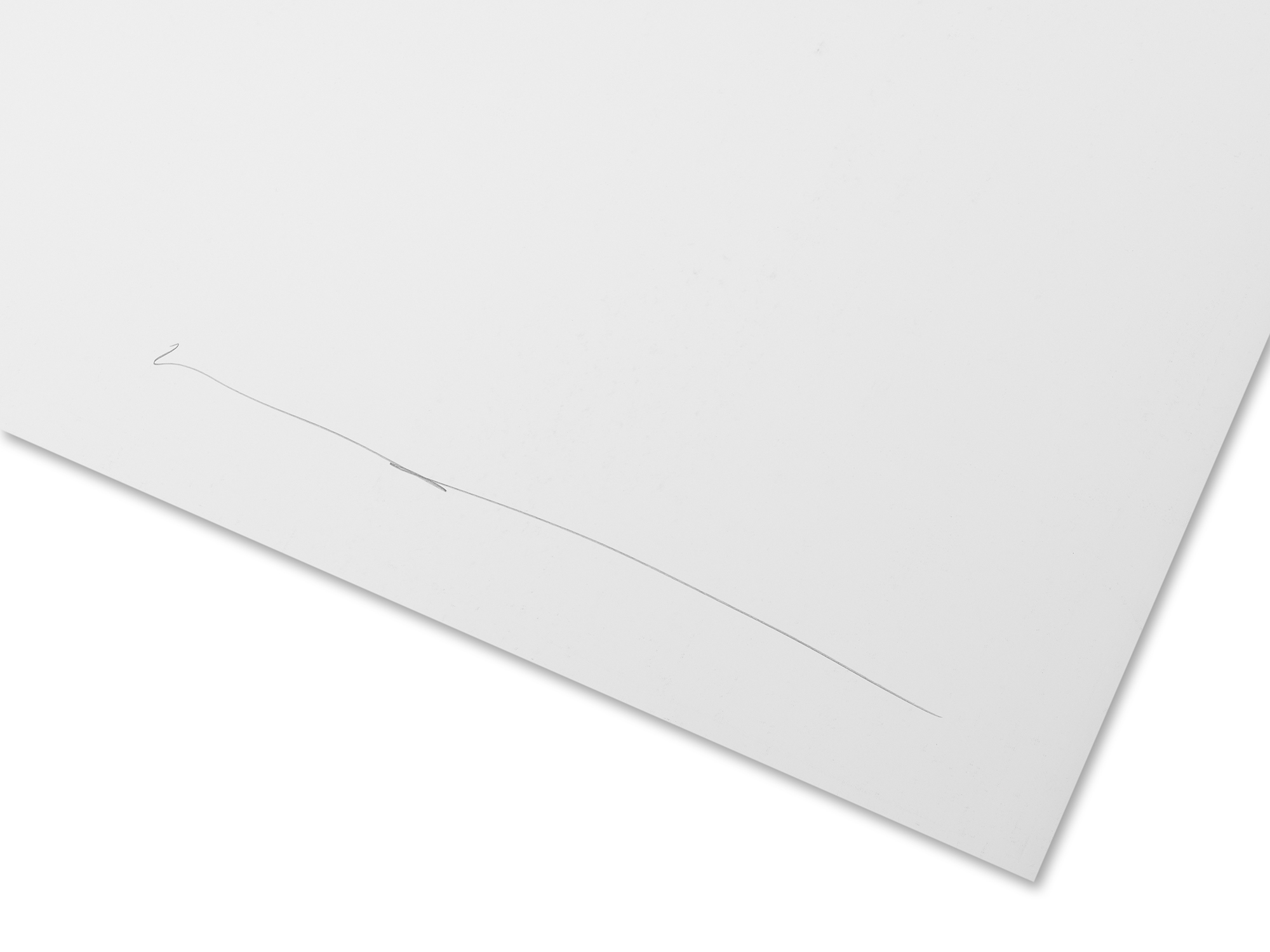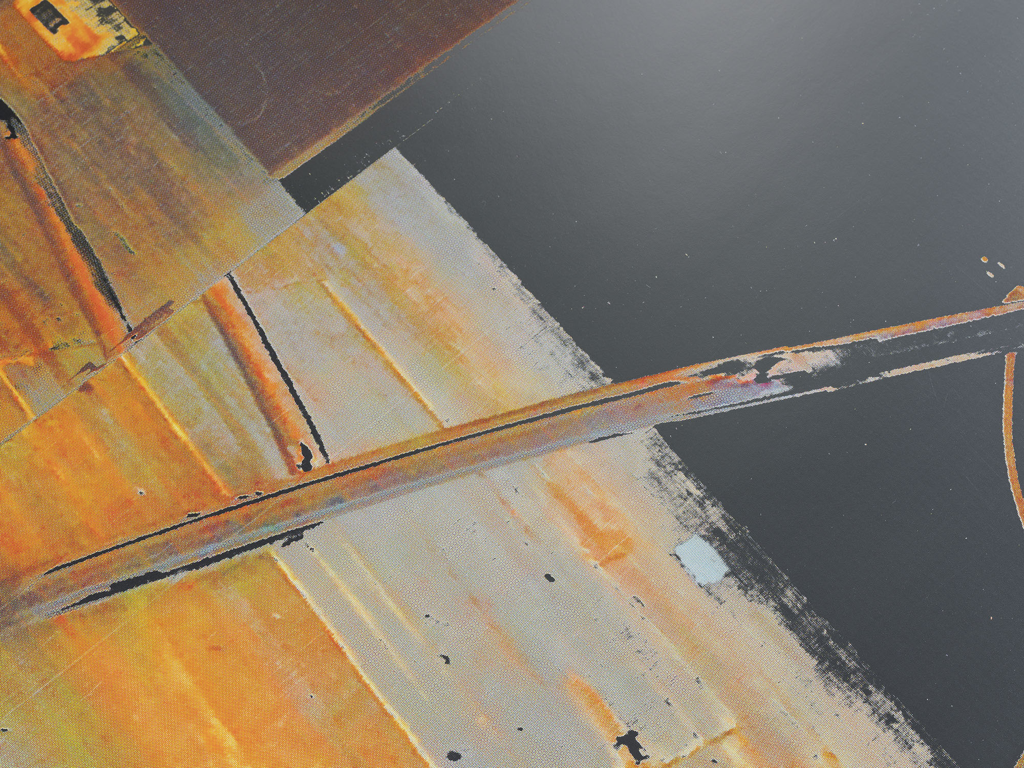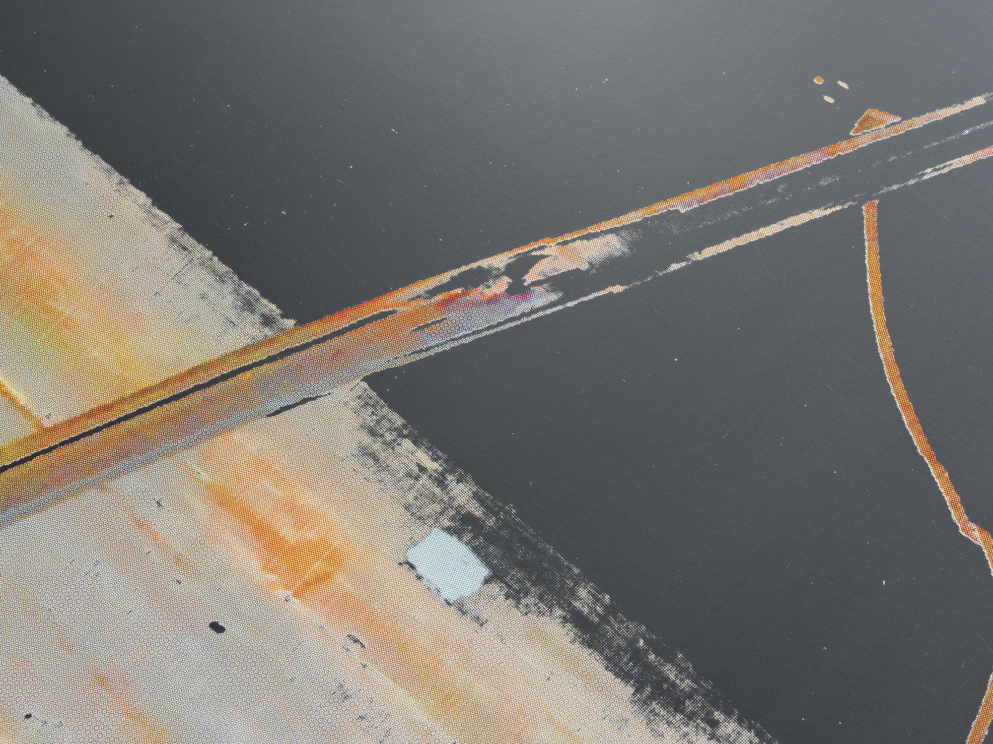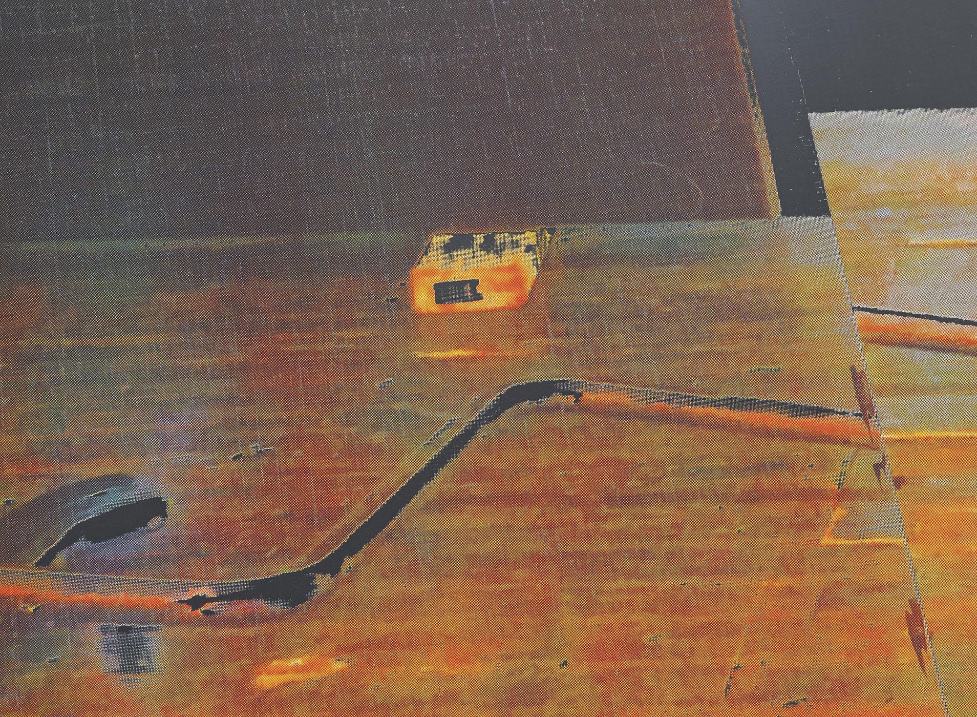 Repeated under different electronic formats, these signs—may they be Xs, Us, or even the image of a flame scanned from a book—have all become contemporary art icons. Though Guyton also produces sculptures, drawings, and installations, he chose this time to limit himself to the “painting” format. He is taking on a new chapter in his work with a series of clearly figurative pieces, alongside more abstract works, all created between 2015 and 2016. The central image of the exhibition, spanning various dimensions, is a photograph taken in his studio. In the foreground lying on the floor is one of his sculptures, a modified tubular framework from a Marcel Breuer chair. In the background, we make out the right side of one of his “Black paintings,” as well as the white wall on which it is resting. The series was completed with representations of the wooden floor in his New York studio, as well as close-ups of bitmap files.
