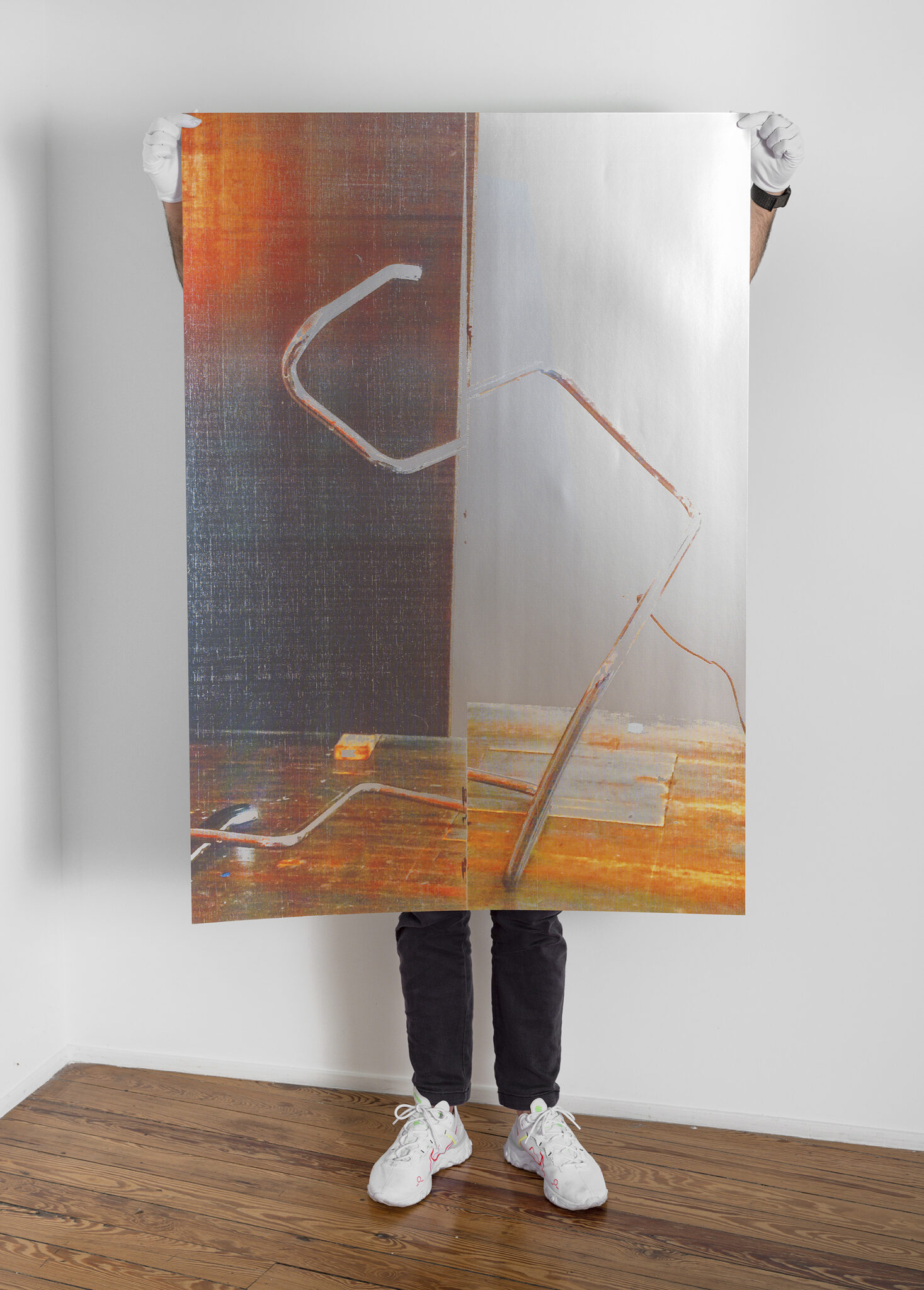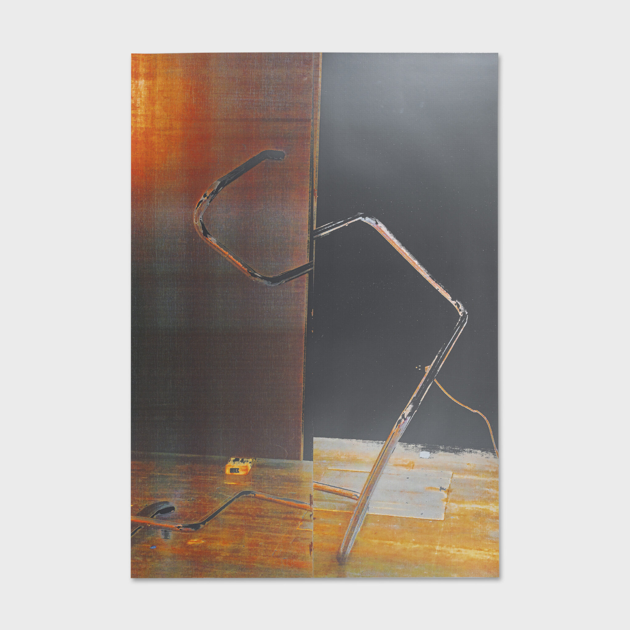 This is one of Wade Guyton’s emblematic sculptures: the tubular frame of a Marcel Breuer chair modified and placed on the floor of the studio.
