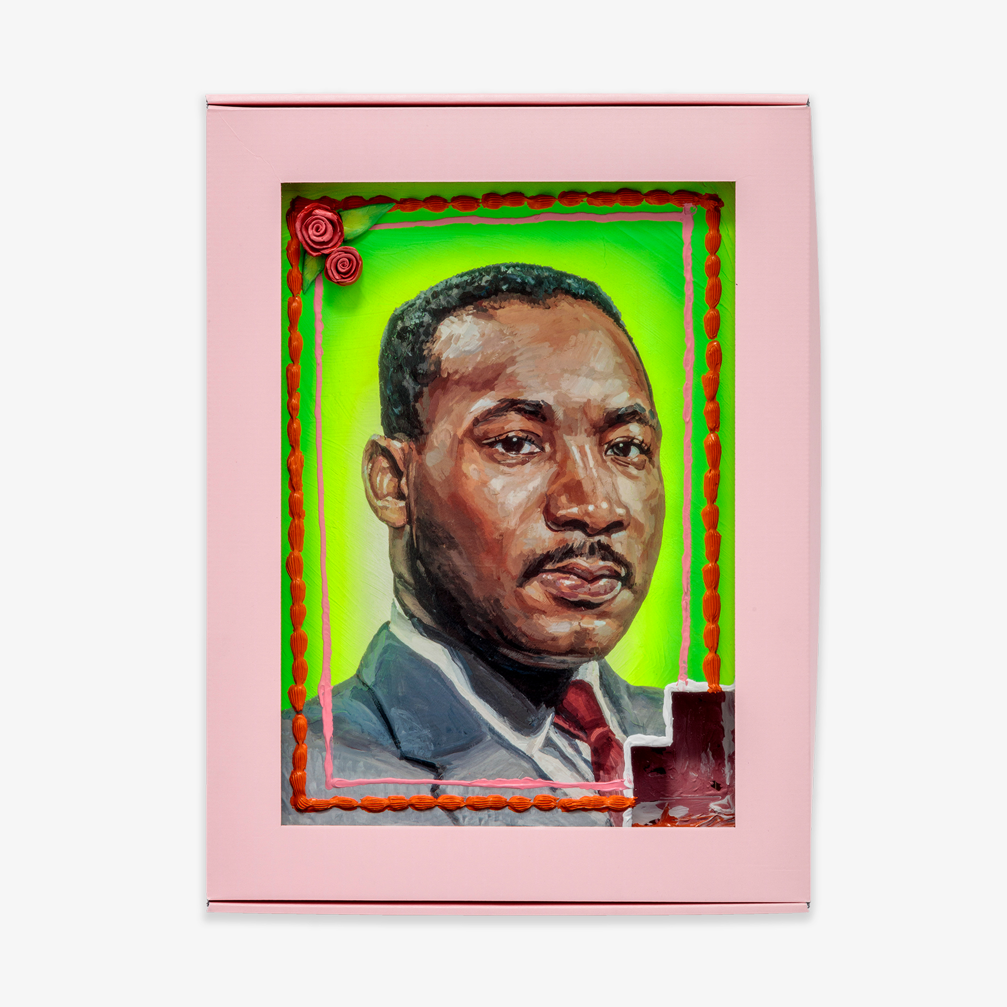 The edition Happy Birthday MLK features an ink transfer from Martinez’s 2023 portrait of the late civil rights leader Martin Luther King Jr. Each panel has a unique airbrushed background with hand-sculpted ceramic roses and decorative extruded line work made using acrylic paint. The work is mounted onto a shaped acrylic mirror and is packaged in a custom printed archival box in the style of a commercial bakery.