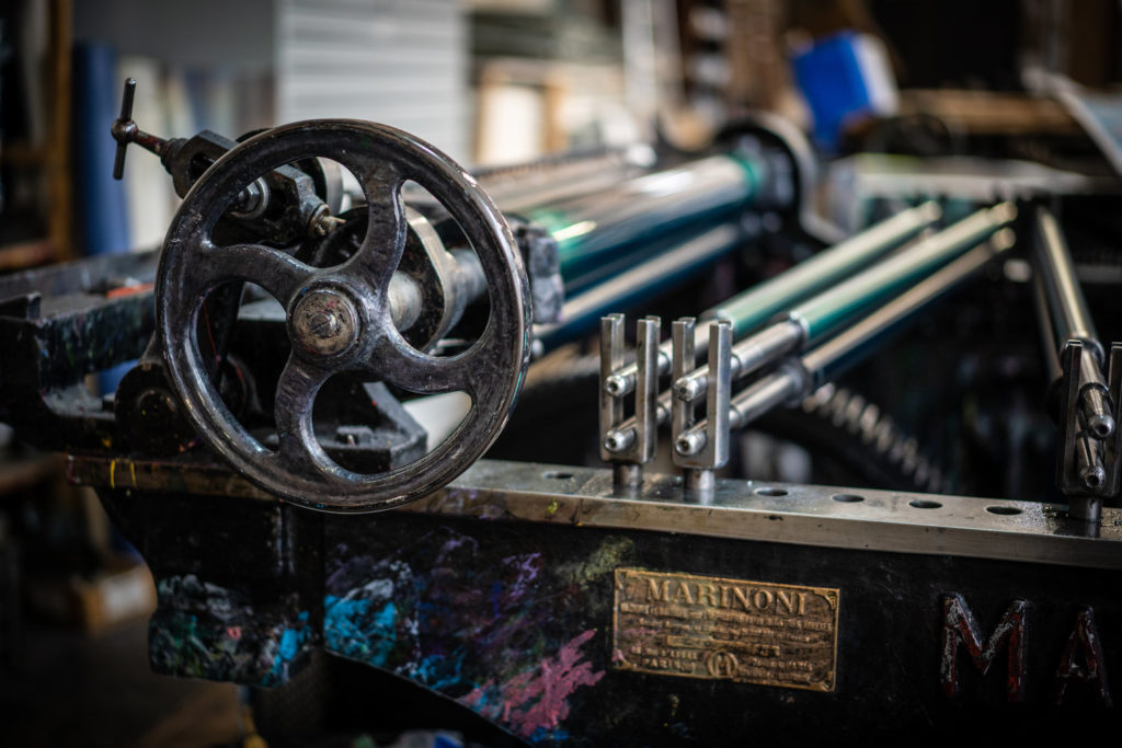 The word lithography comes from Ancient Greek, from lithos, meaning “stone”, and graphein, meaning “to write.” The technique was invented in 1796 by German author Alois Senefelder as an economical method of publishing theatrical works. Originally lithographs were created by etching words or images onto stone. Even with the advent of new technologies and the evolution of the printmaking process, some artists and printing houses still practice this traditional printing technique, as we do for the production of our stone lithographs.